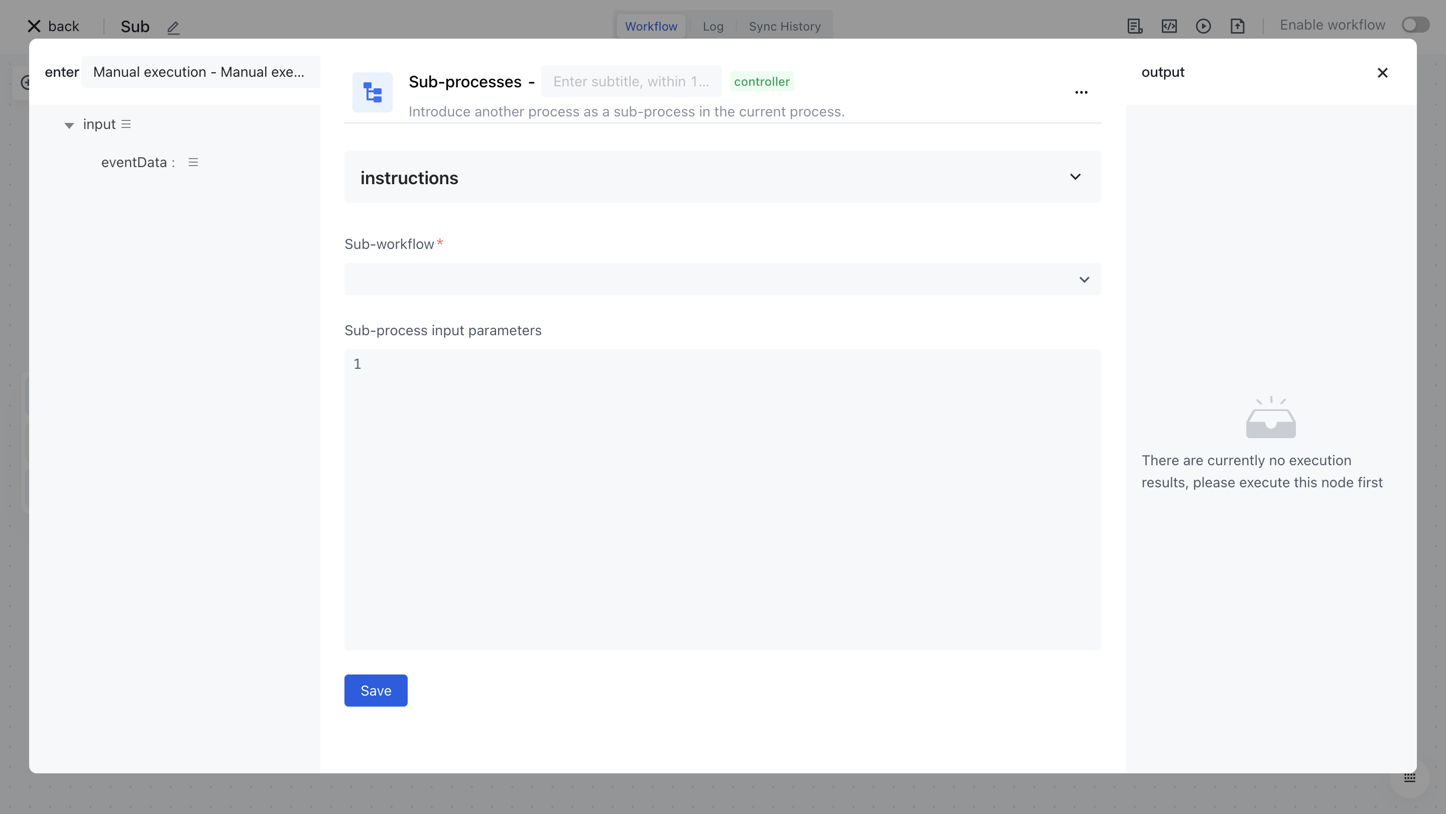 After saving the "sub process" configuration, when executing the workflow, the sub workflow will be automatically triggered and the "start parameter" (optional) will be used as the input parameter for the sub process.