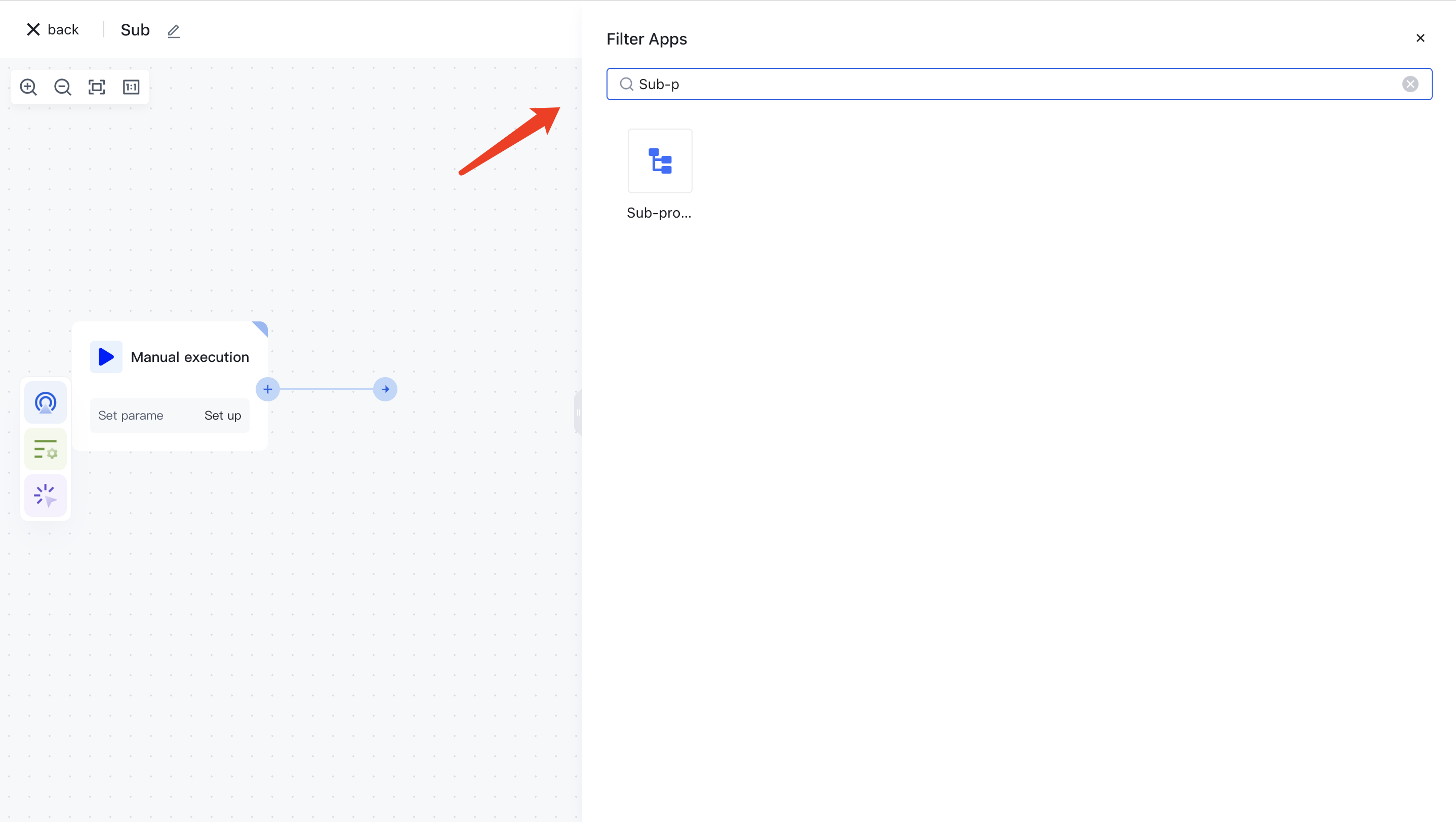 You can find the "sub process" node in the "process operation" category, or directly search for the "sub process" keyword in the application search box.