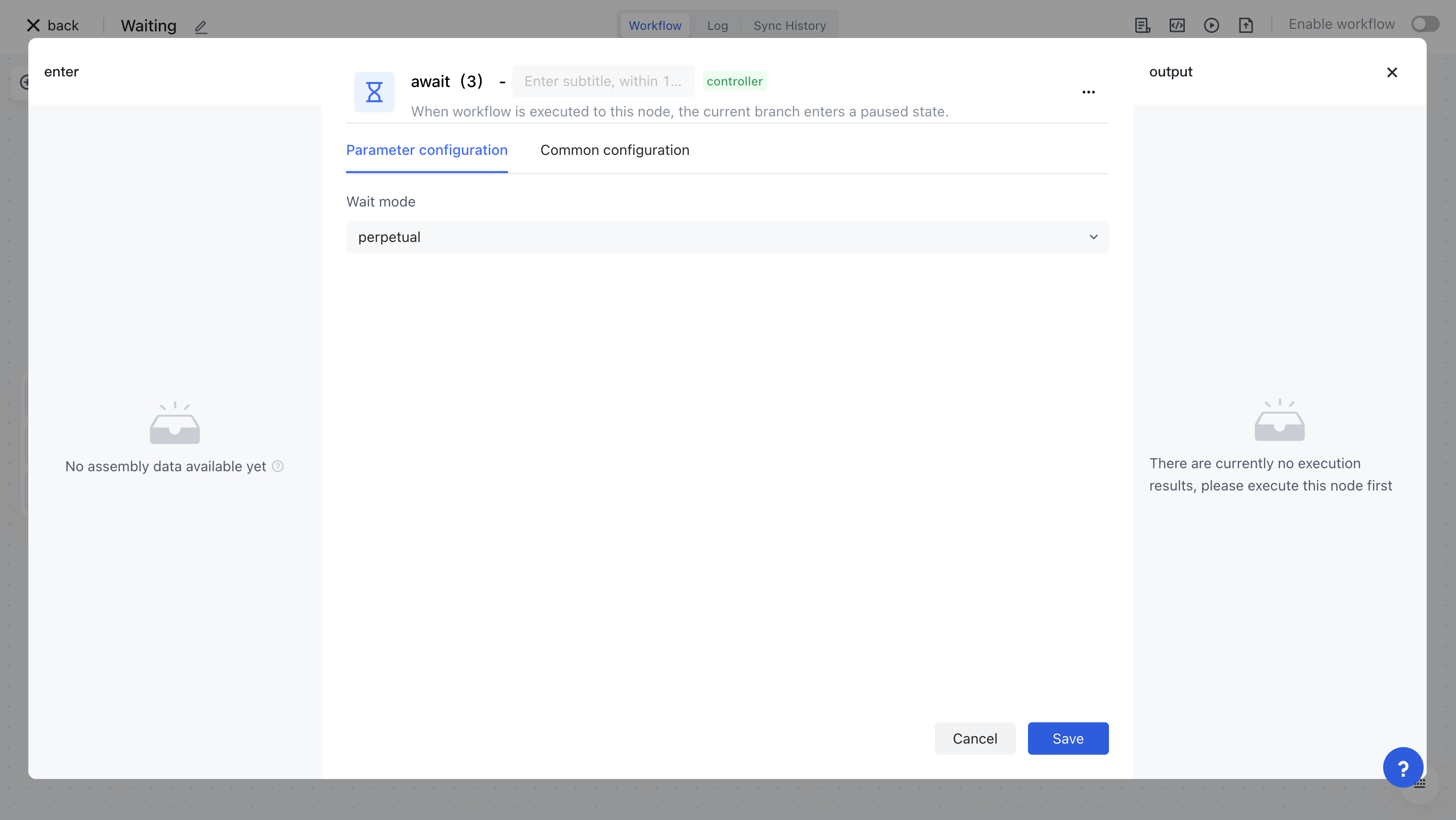 Imagine a scenario like this: when performing upstream synchronization, if the user's comparison calculation results show that a large amount of data needs to be deleted, you need to permanently pause the entire flow for this scenario, wait for the administrator to manually confirm before resuming; Alternatively, after executing a node, you may wish to wait for a certain amount of time before continuing with the execution. You can use waiting nodes to implement the above scenarios.