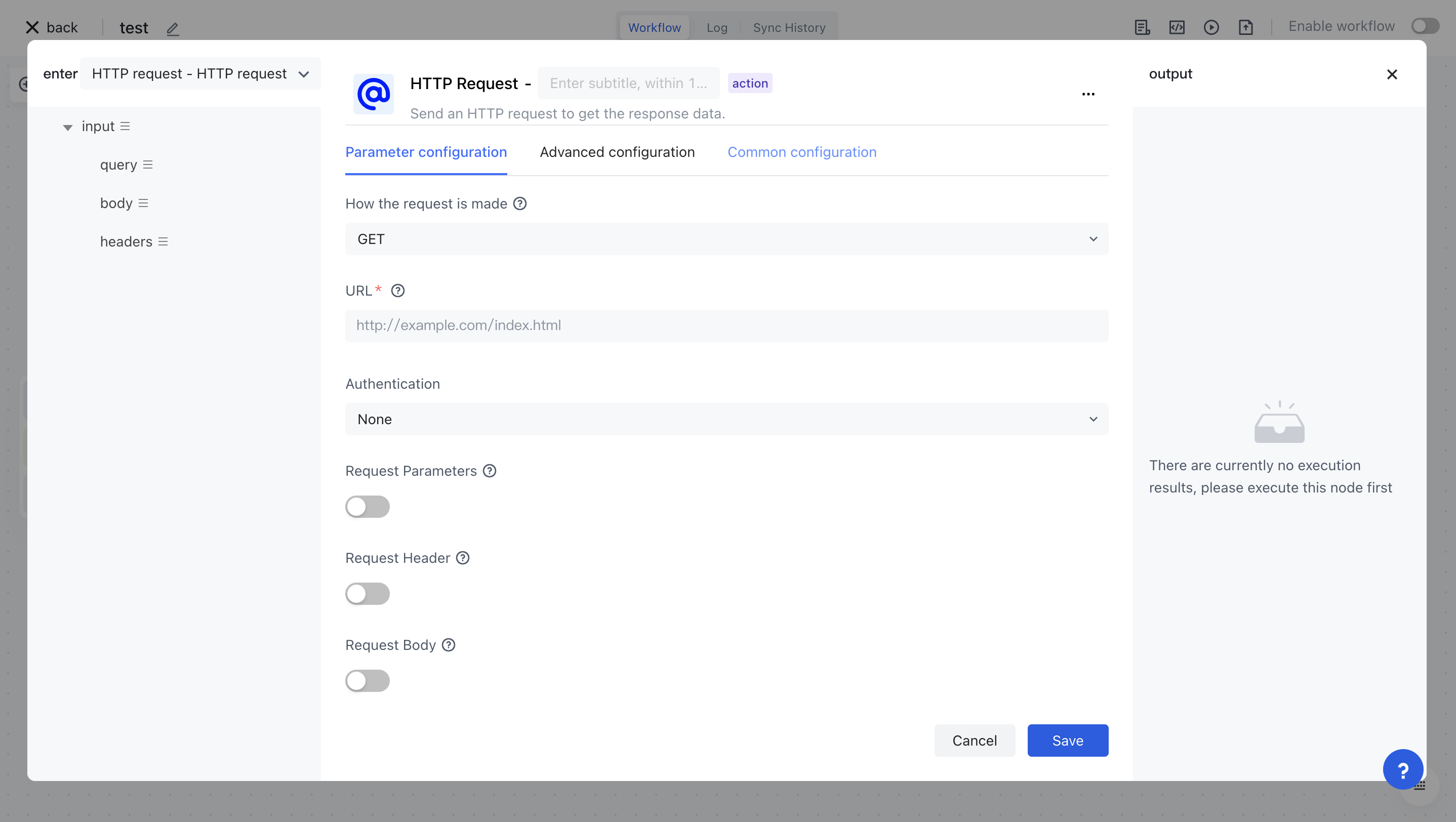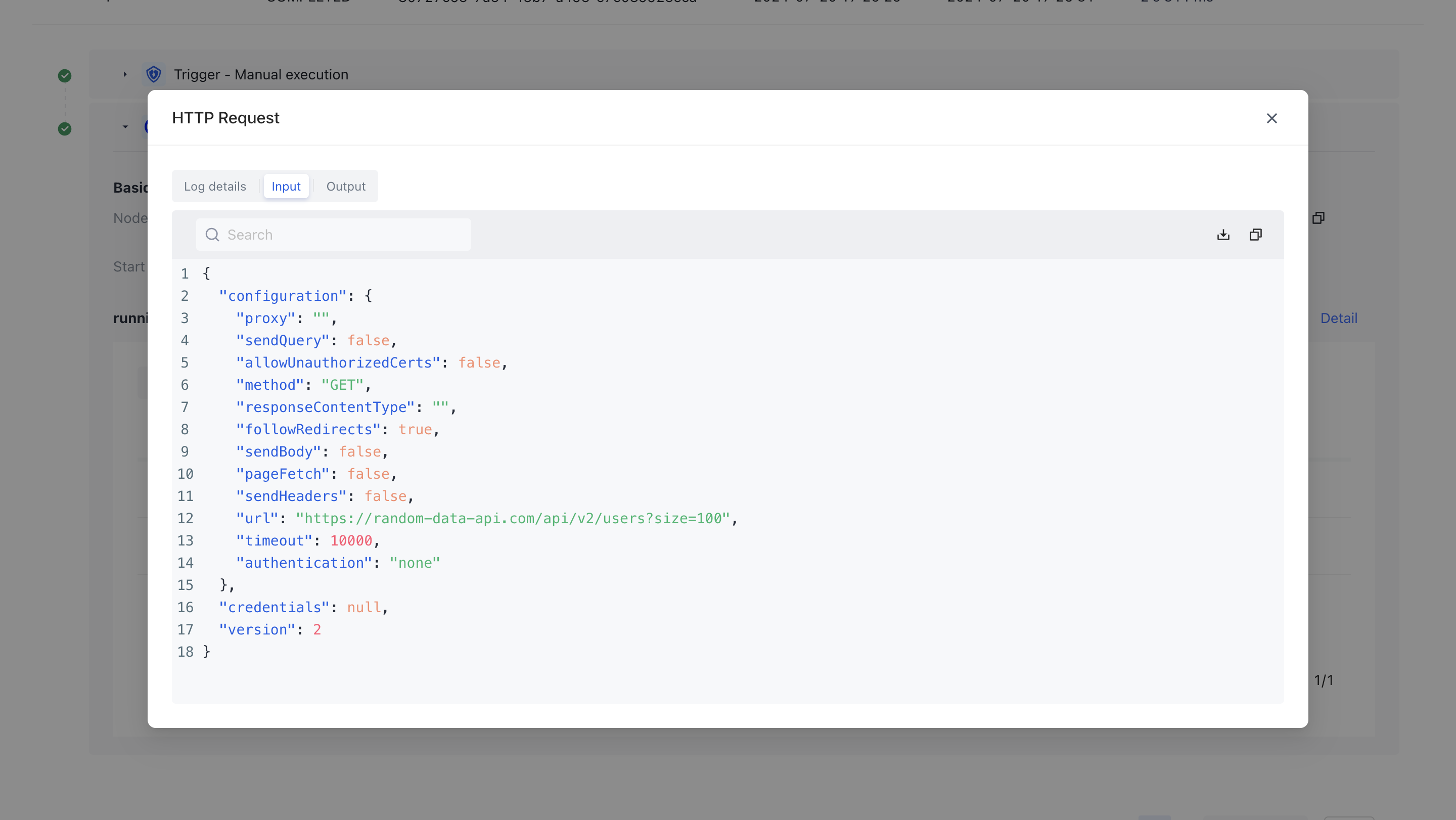 Create a new workflow and add an HTTP request node, enter it in the URL field https://reqres.in/api/users . All subsequent examples will call this endpoint: