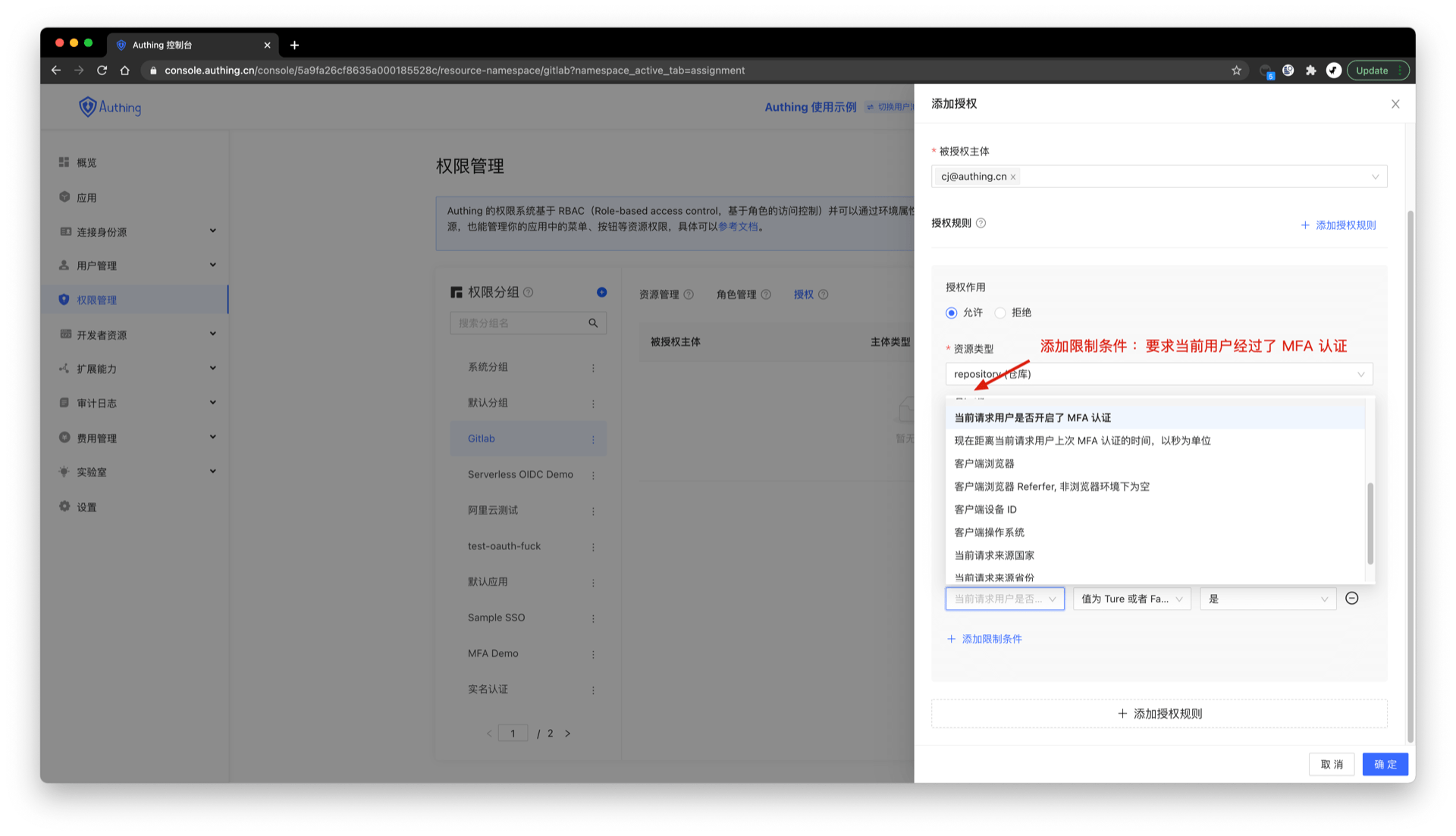 我们在授权资源的时候,可以指定限制条件。例如在下面的例子中,我们添加了一个限制条件:要求当前请求的用户经过了 MFA 认证。
