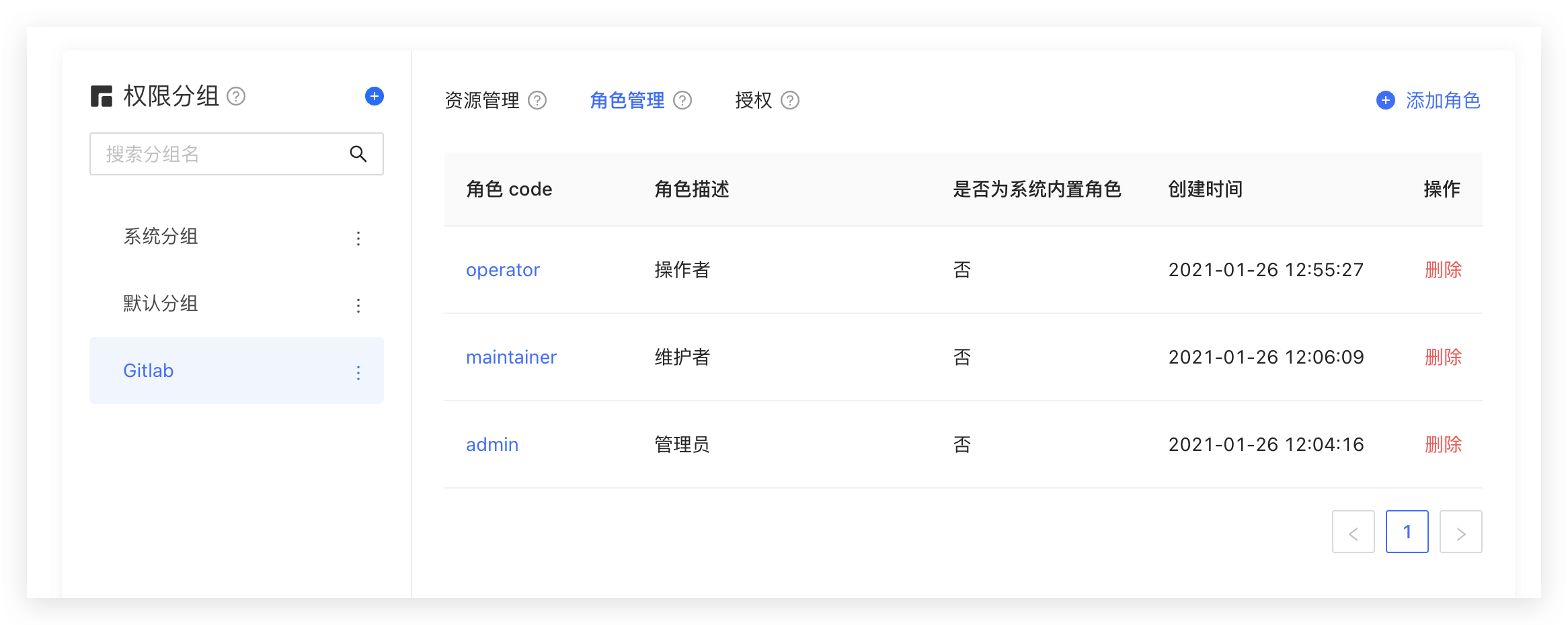 - 角色 code: 该角色的唯一标志符,权限分组内具有唯一性,只允许包含英文字母、数字、下划线 _、横线 -,这里我们填