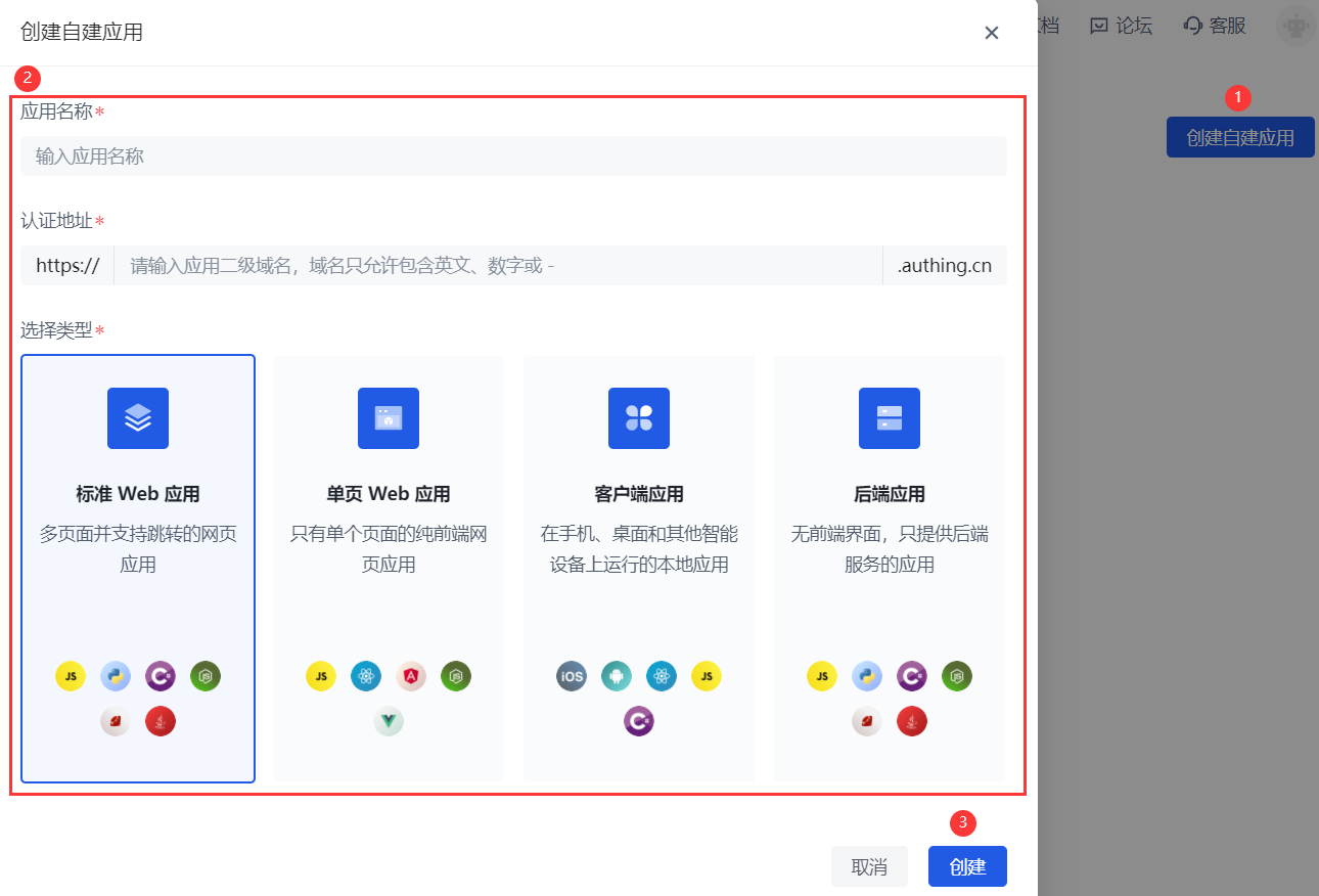 选择类型:按照你的业务应用的实际类型对应选择在 Authing 的应用类型。