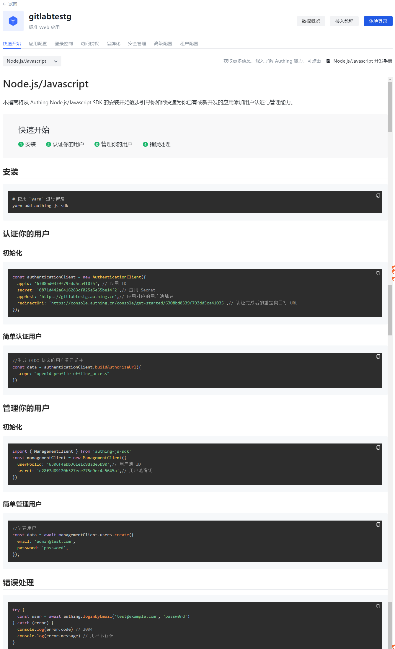 各应用的 快速开始 标签页将会简要介绍如何安装并使用各语言 SDK 为已有或新开发应用快速认证、管理用户,并提供常见错误处理的方法。