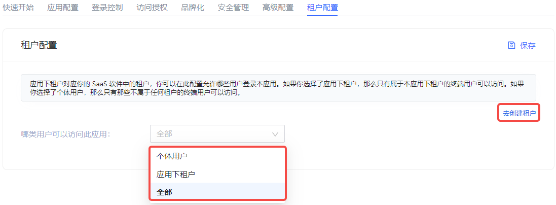 应用下租户对应你 SaaS 软件中的租户。管理员可以在此配置允许哪些用户登录当前应用:如果选择了 应用下租户,那么只有该租户下的终端用户可以访问。如果选择了 个体用户,那么只有那些不属于任何租户的终端用户可以访问。