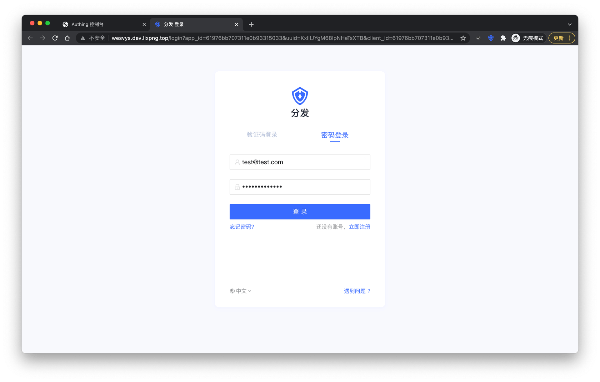 点击单点登录应用列表的「前往体验」按钮,进入 Authing 应用面板登录页面。