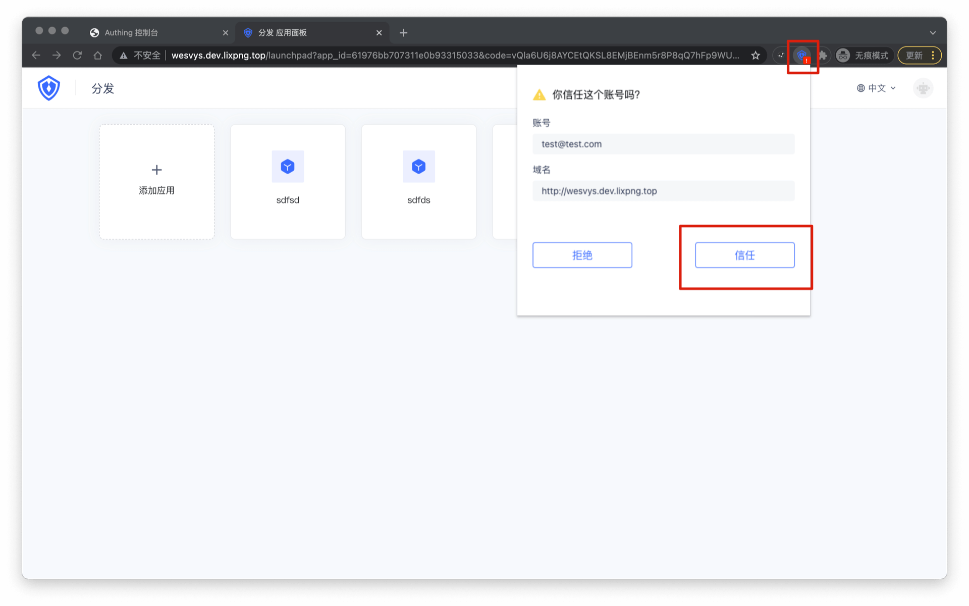 插件图标上将会出现红色叹号,点击「插件图标」,打开插件页面,点击「信任」当前账号。