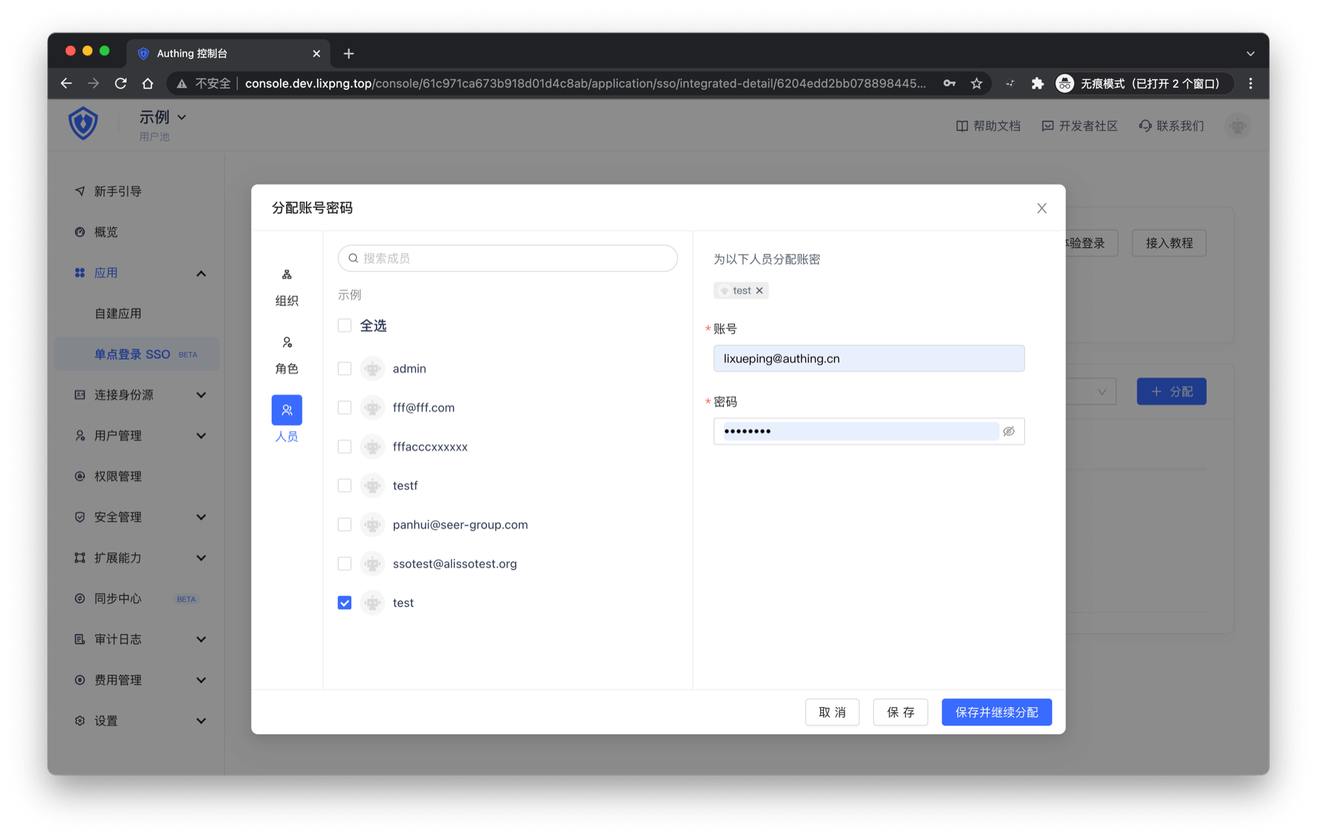 在分配账号页面,给用户分配应用账号