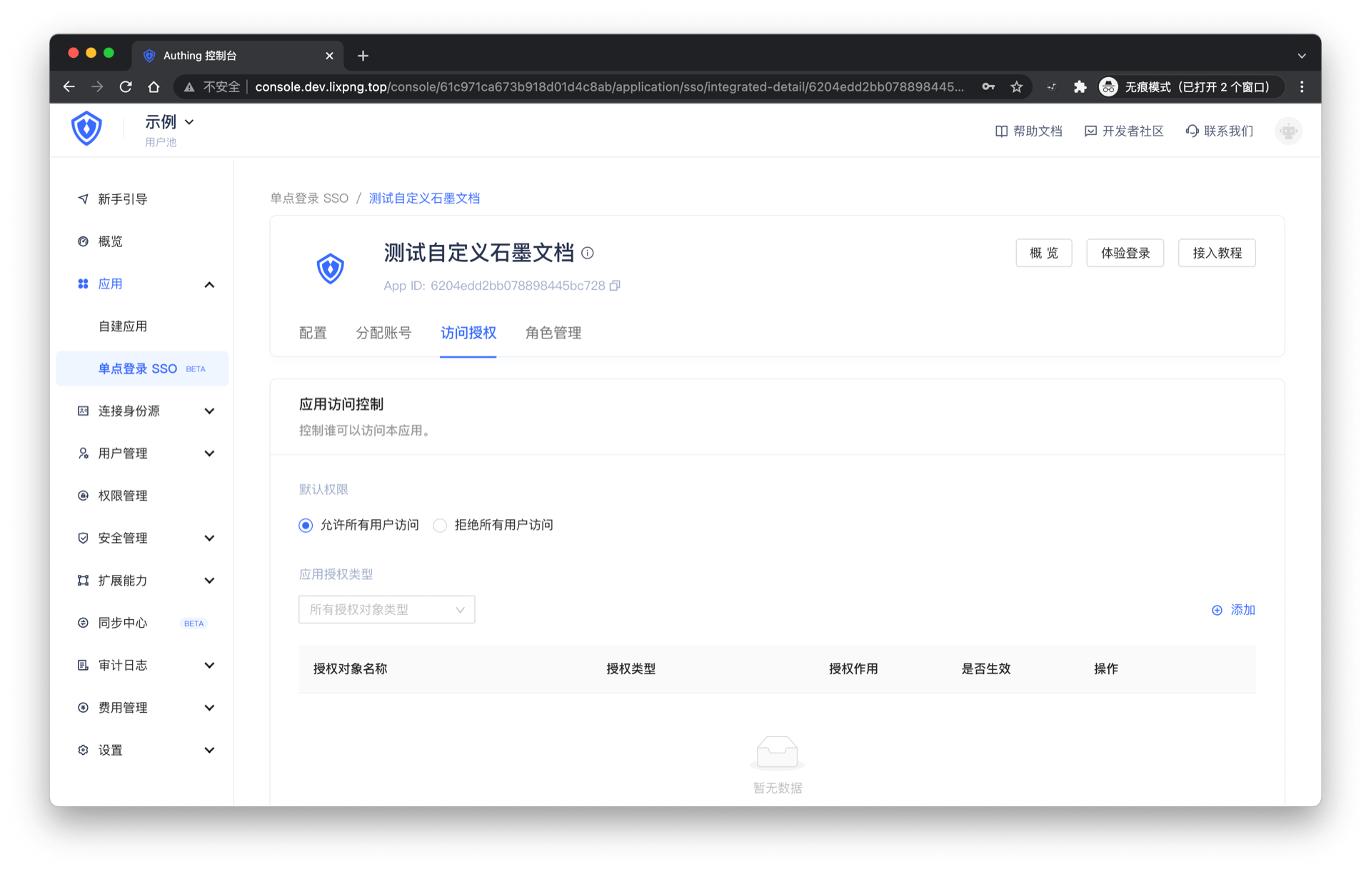 在访问授权页面,选择「允许所有用户访问」