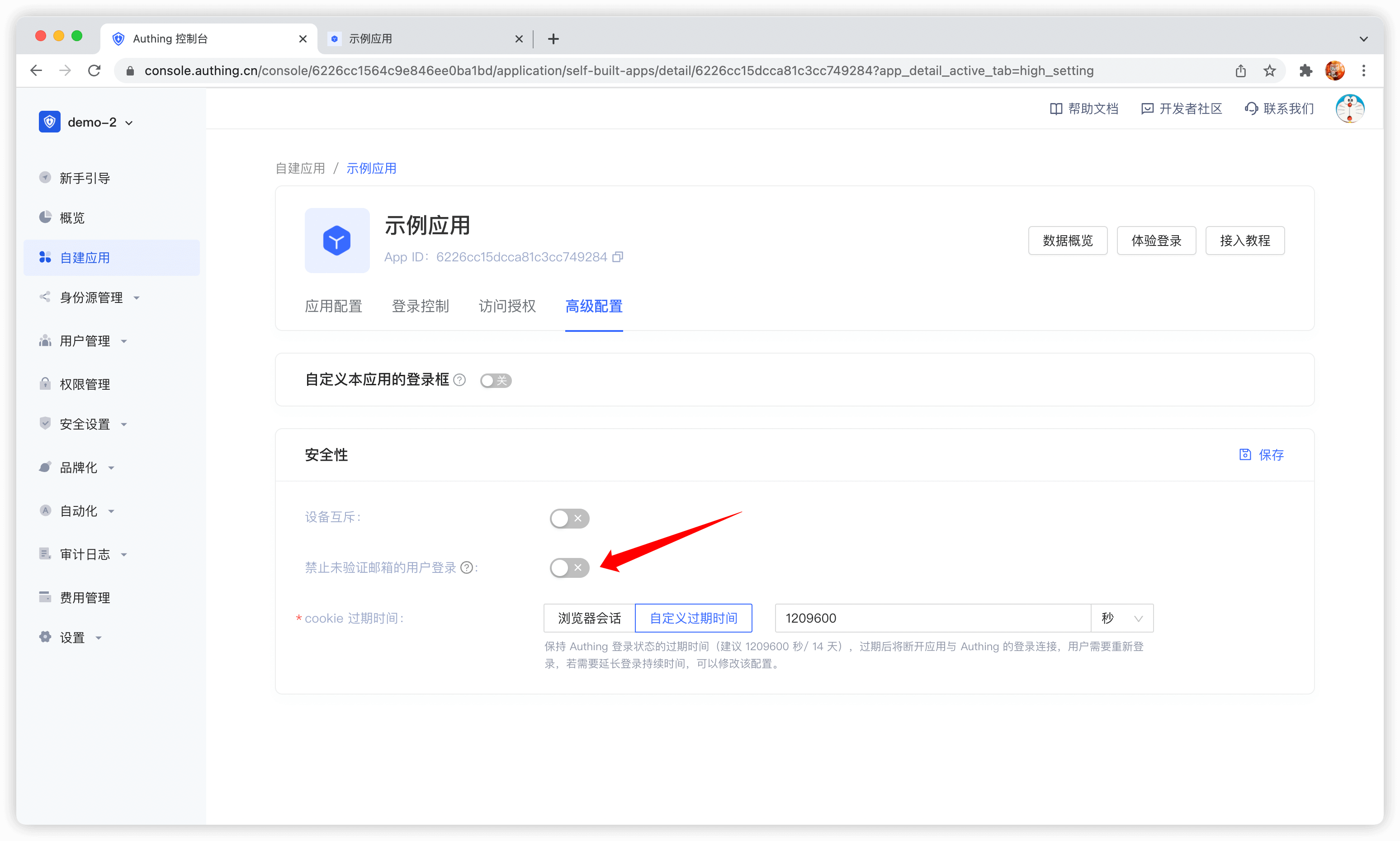 默认情况下,未验证邮箱的账号可以进行登录,你也可以在应用详情中修改次配置: