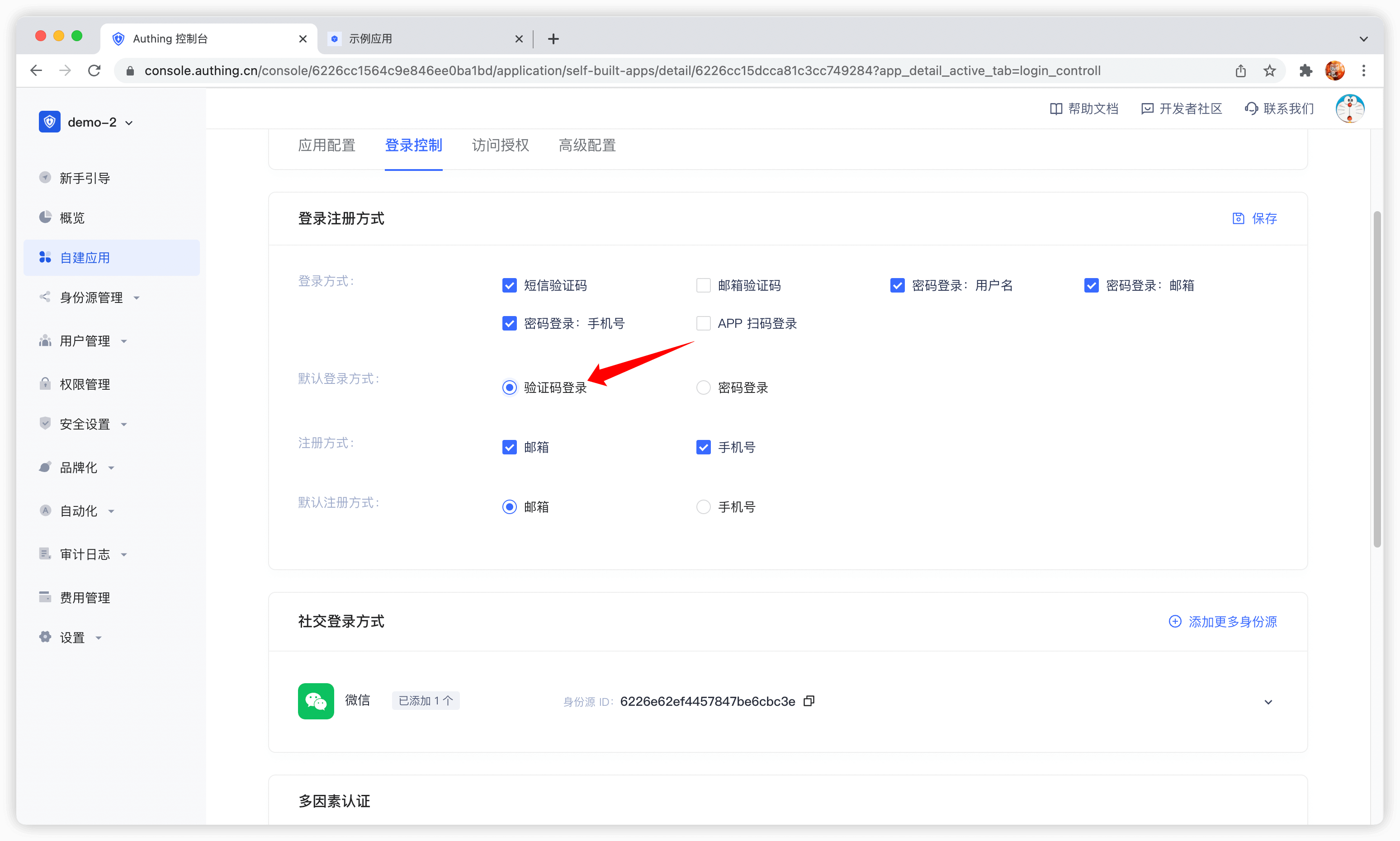 默认情况下,应用的默认登录方式为密码登录,你可以在应用配置中修改: