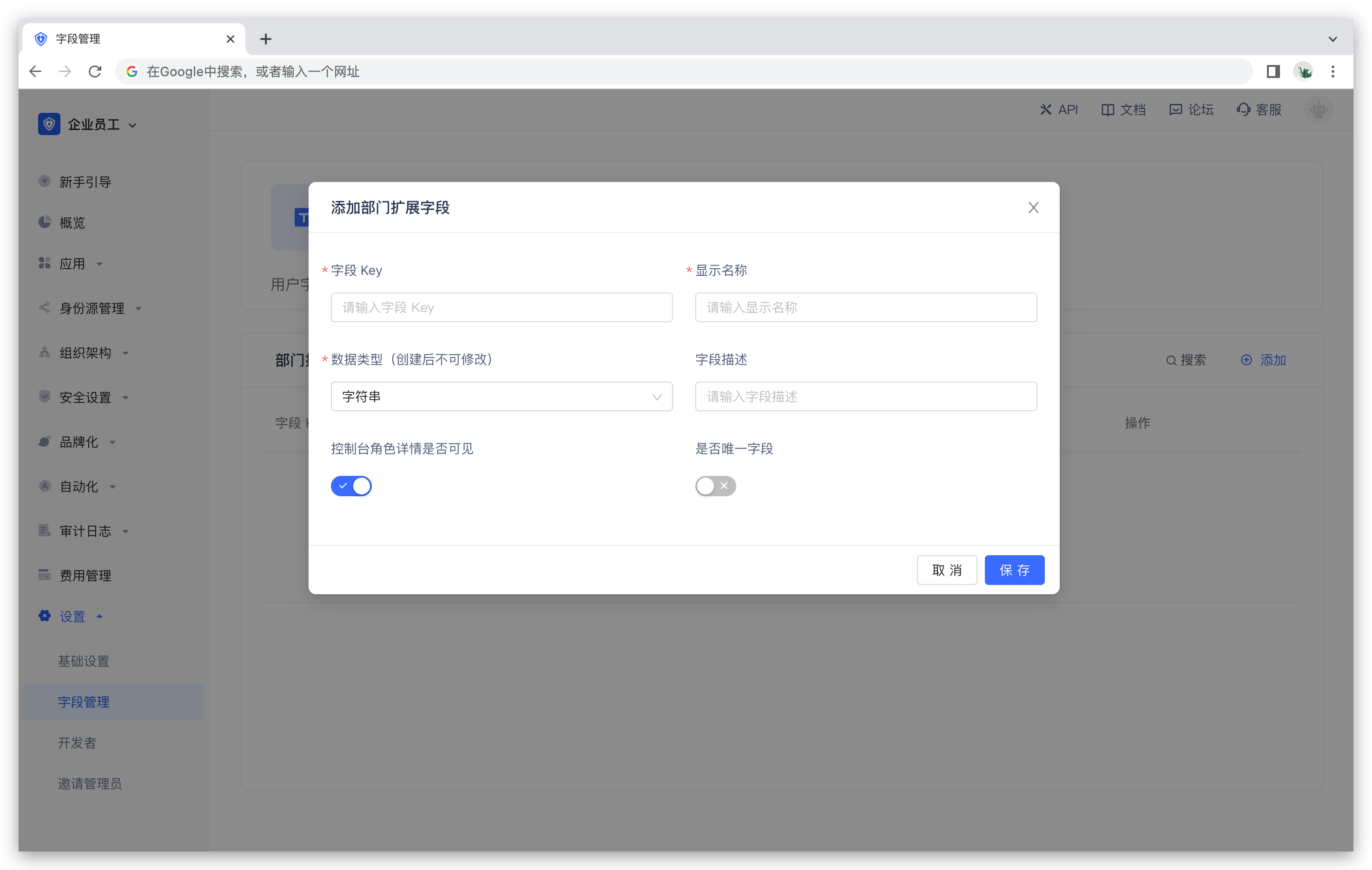 部门扩展字段是除了基础部门字段之外,可以给部门添加的额外字段。开发者可以通过设置自定义字段,存储少量业务相关的数据。