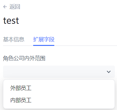如开启了 控制台角色详情是否可见 开关,则在控制台权限模块下 角色管理 页面查看某角色详情时,可在 扩展字段 标签页查看并设置角色自定义字段。