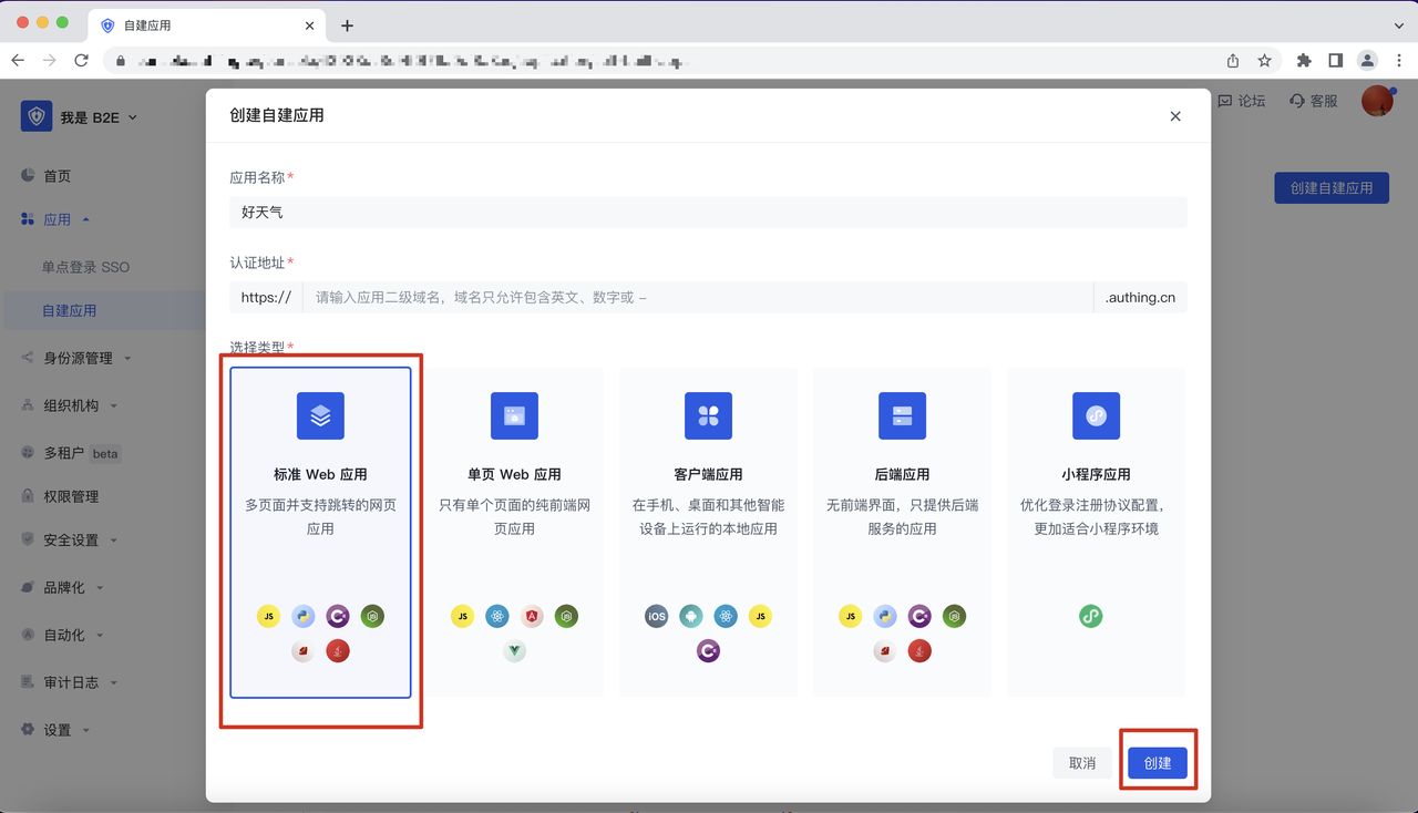 步骤 1 : 在 Authing 控制台,创建一个 Web 端应用: