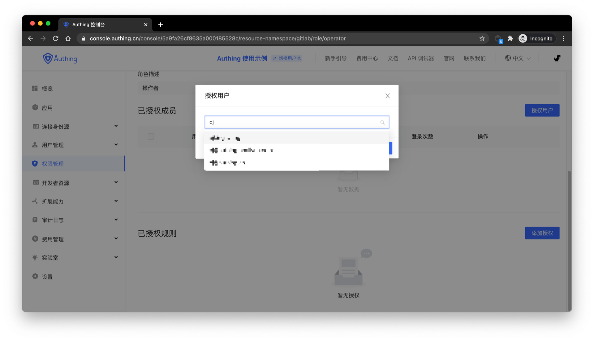 在角色详情页面,你可以将此角色授权给用户。你可以通过用户名、手机号、邮箱、昵称搜索用户: