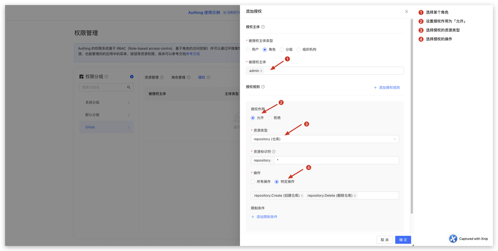 而且 Authing 还同时支持给用户、角色授权,如果用户在某个角色中,他也将继承这个角色被授权的权限。所以 Authing 既能够实现标准的 RBAC 权限模型,也能在这基础上进行更细粒度、更动态的权限控制。 比如下面这个例子中,我们给 admin 这个角色授权了 repository 资源的 Create 和 Delete 权限: