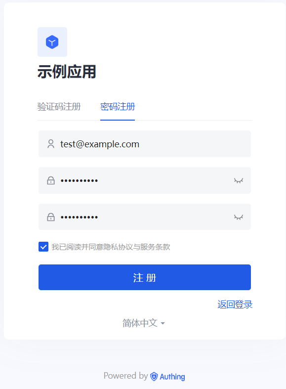 点击 立即注册,选择 密码注册,输入邮箱和密码,再次确认密码,勾选同意隐私和服务条款后,点击 注册 按钮。