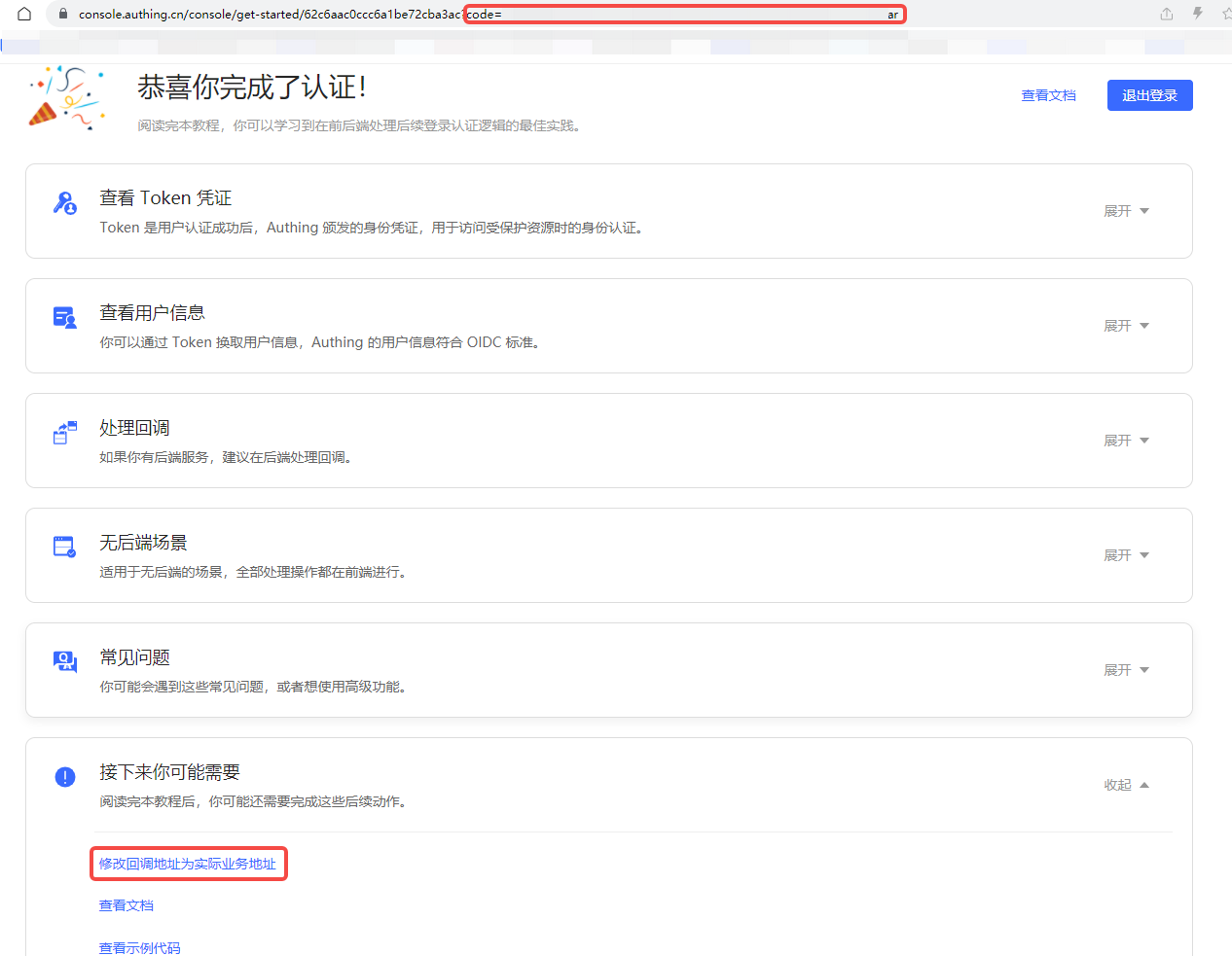 回到登录页面,输入刚刚创建账号的邮箱和密码,点击 登录,登录成功之后,你将跳转到一个回调指引页面(在这个页面你可以查看后续详细的指引流程以及最佳实践,建议完整阅读一遍),你可以看到在 URL 中包含了 code 查询参数,我们下一步会用此 code 换取 token。