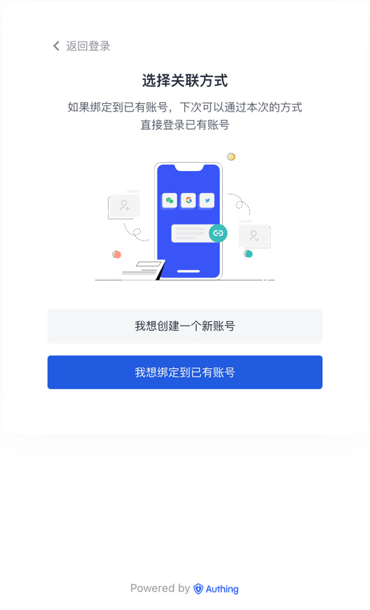 如果用户选择「创建新账号」,则会跳过账号绑定流程,登录成功直接在 Authing 用户池创建新的独立的用户账号;