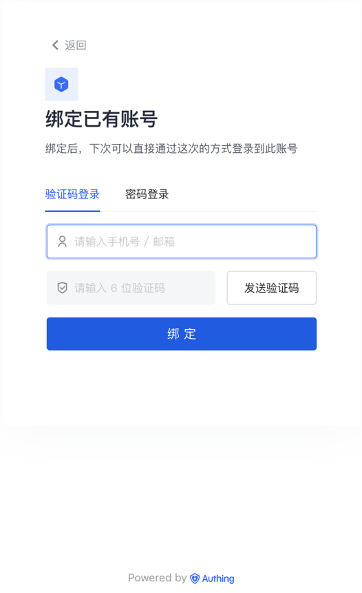 除了在登录时绑定账号之外,你的用户也可以直接在**个人中心 (opens new window)**(无论你使用的是 Authing 的个人中心或者使用你独立开发的个人中心)进行第三方账号的绑定(也可以自行解绑)。完成绑定后,即可以通过任何一种登录方式(常规的账号密码、第三方账号)登录至同一个账号。