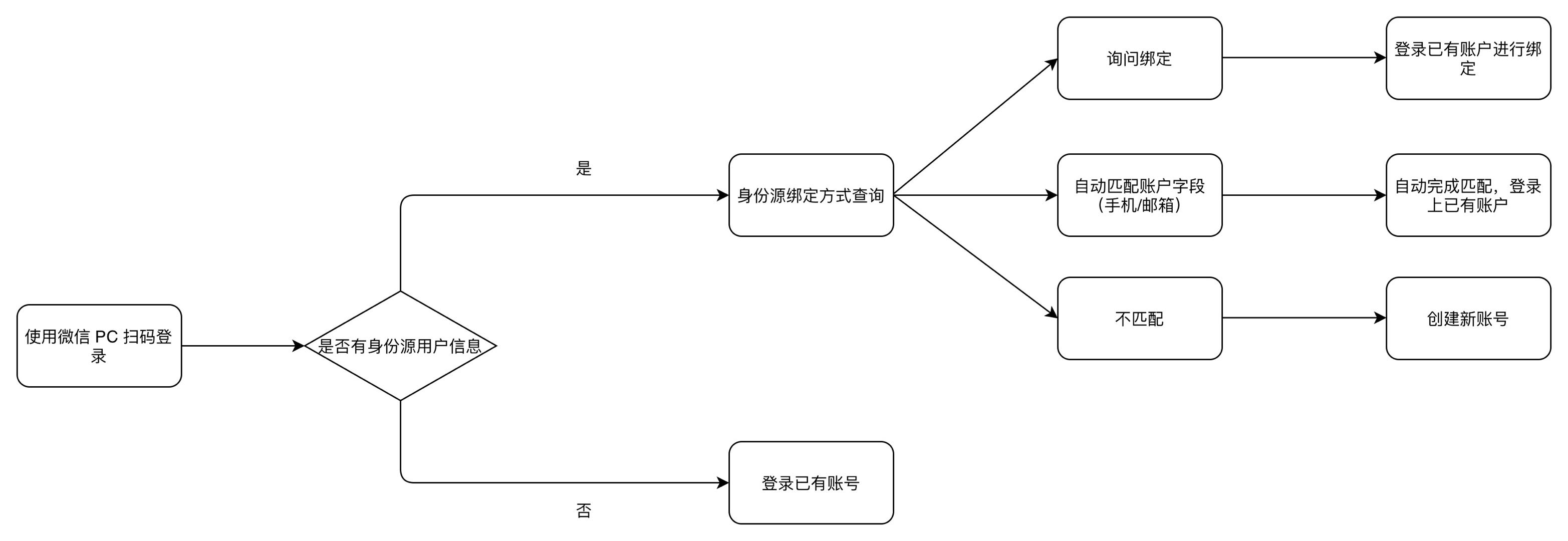 在开始详细介绍账号绑定功能之前,我们首先以「PC 微信扫码」身份源登录方式为例介绍 Authing 的账号绑定功能在你的用户登录全旅程中的作用,详见下图:
