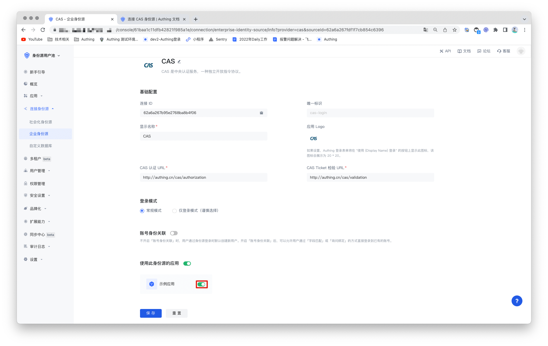 3.2 在已创建好的 CAS 身份源连接详情页面,开启并关联一个在 Authing 控制台创建的应用。