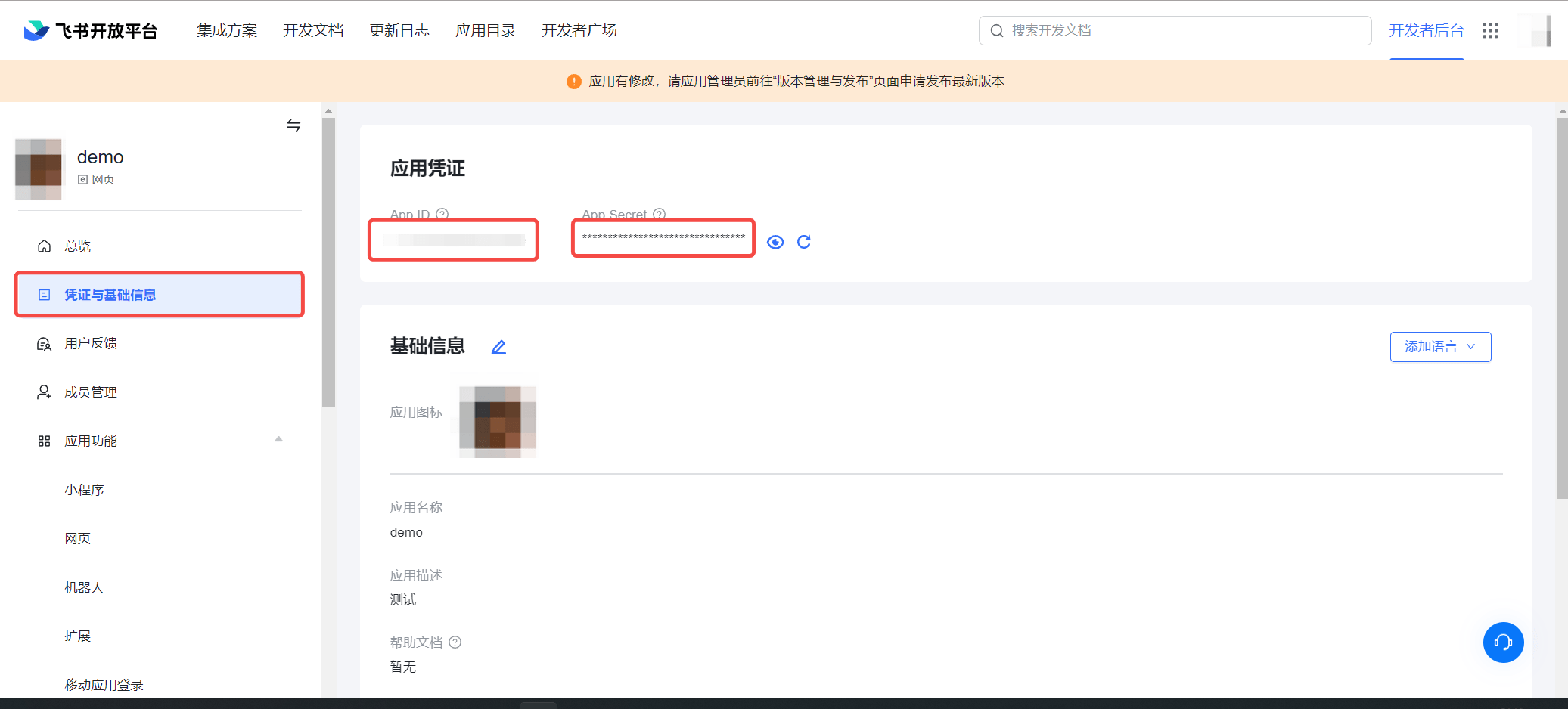 | App ID | 在飞书应用的后台, 凭证与基础信息 中可以看到 App ID 和 App Secret 。 |