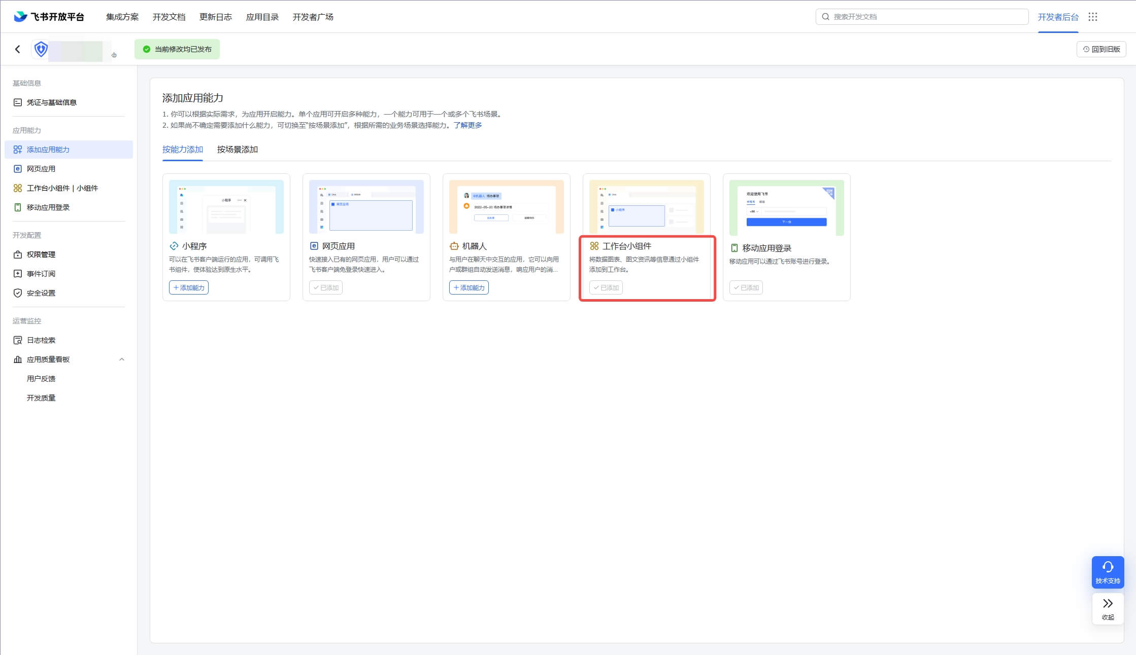 进入创建的应用,点击应用能力,选择工作台小组件,添加能力。具体配置参考飞书小组件-快速开始 (opens new window)