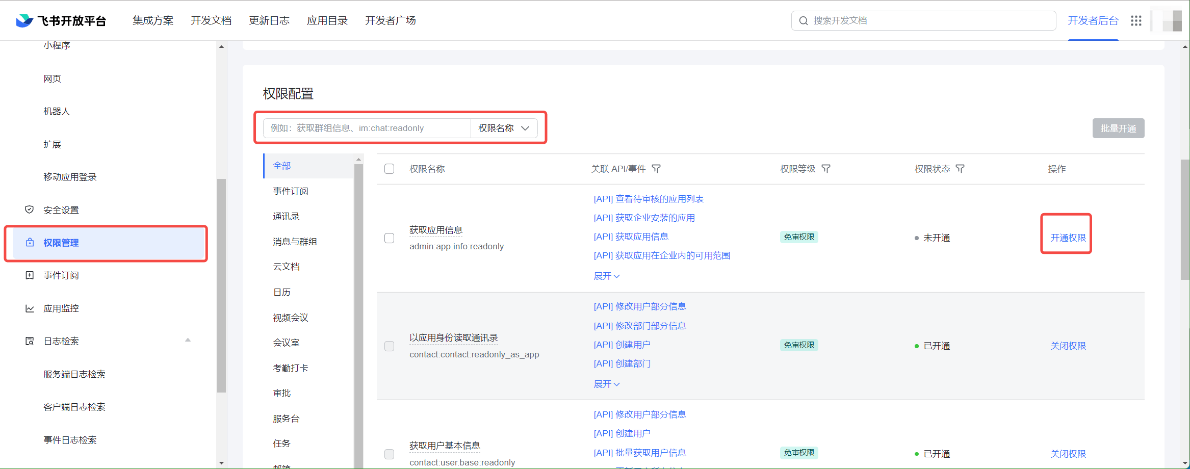 为了能够正常获取到飞书的用户信息,完成认证流程,需要在权限管理页面,完成权限配置,搜索以下权限,并开启: