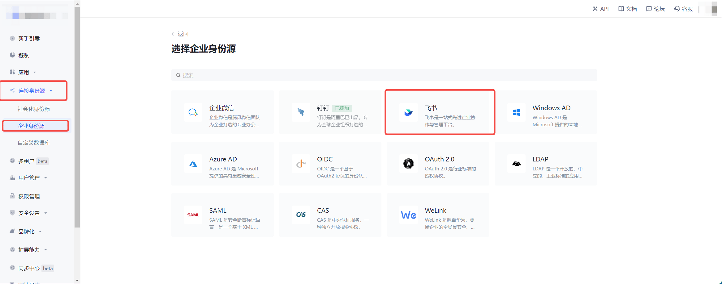 2.1 请在 Authing Console 控制台 的「企业身份源」页面,点击「创建企业身份源」按钮,进入「选择企业身份源」页面,点击「飞书」身份源按钮
