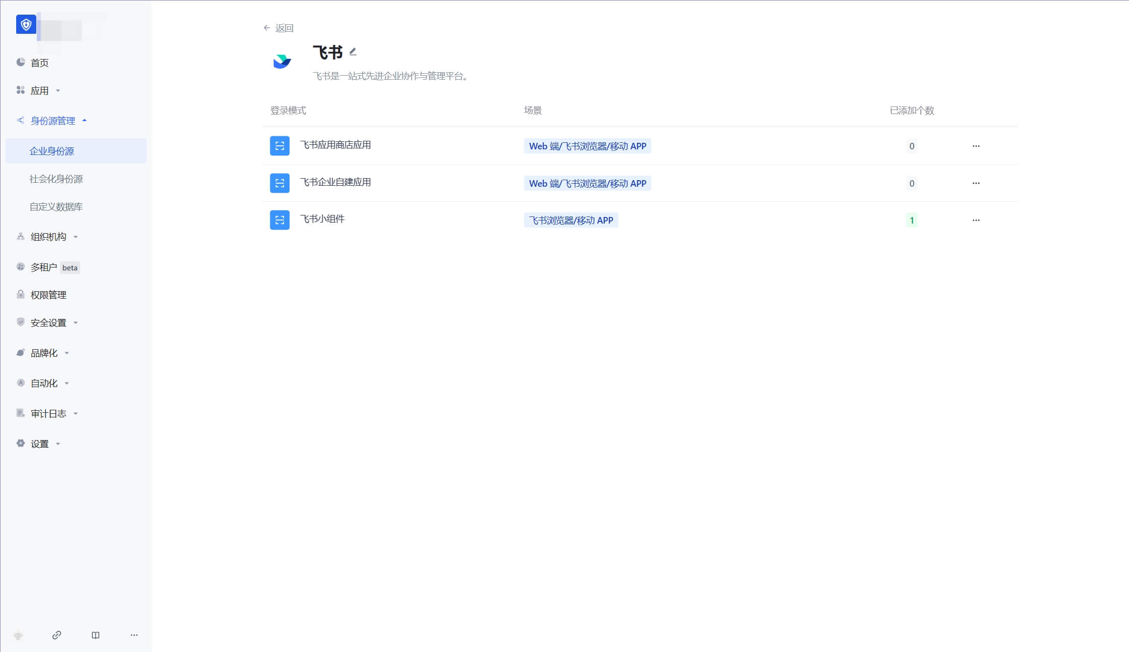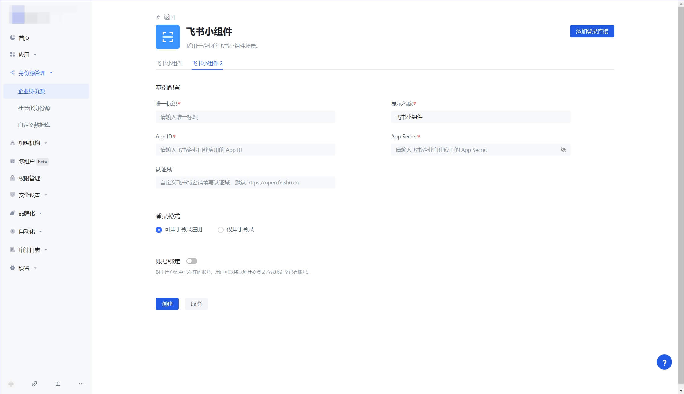 ¶ 第二步:在 Authing 控制台配置 飞书小组件