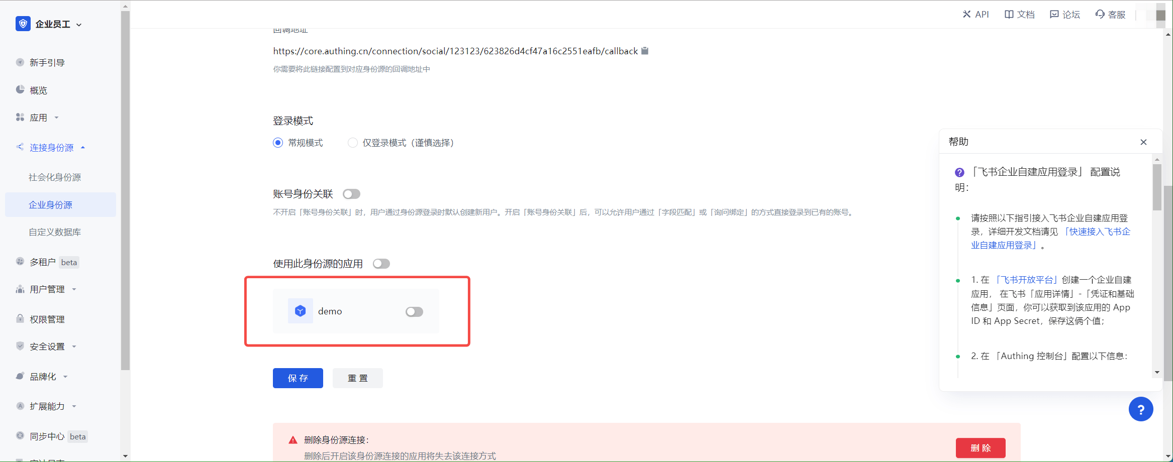 4.2 在已创建好的 飞书小组件 身份源连接详情页面,开启并关联一个在 Authing 控制台创建的应用