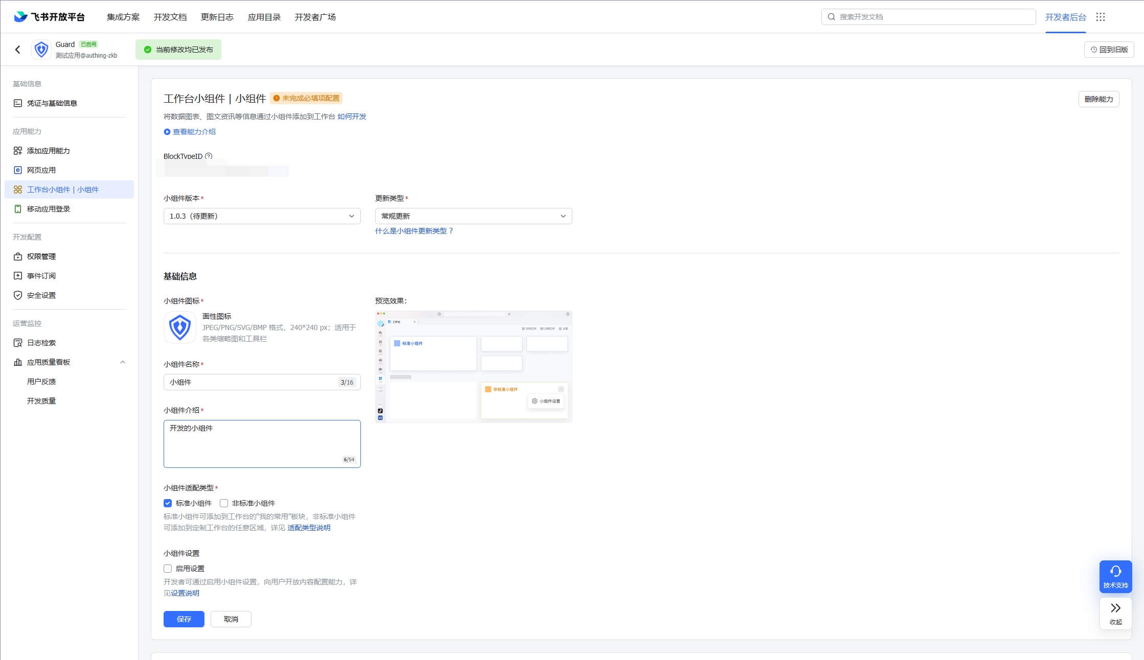 2.3 请在「飞书小组件」页面,填写相关的字段信息。