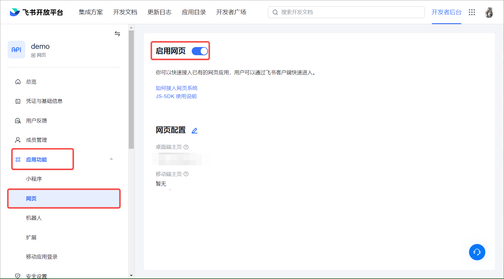 进入创建的应用,点击应用功能,选择网页,开启启用网页功能。