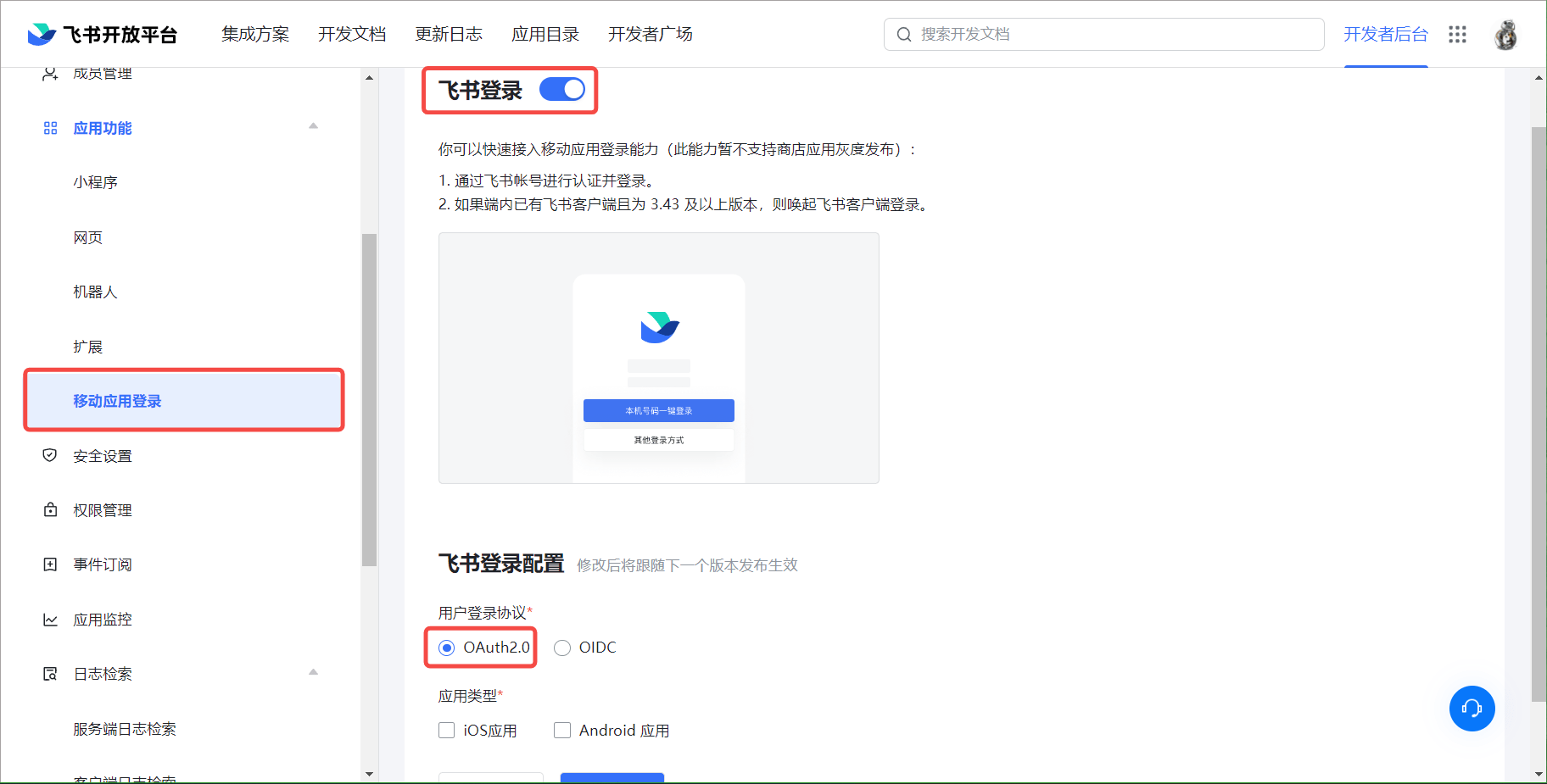 如果你需要 接入移动应用登录能力,点击应用功能,选择移动应用登录,开启飞书登录功能,在下方的飞书登录配置中,用户登录协议选项 OAuth 2.0,并填写移动端应用的配置。