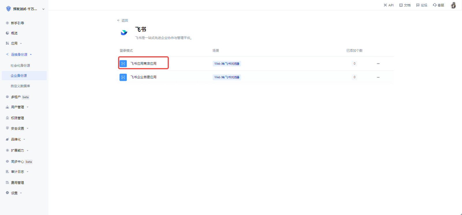 2.1 请在 Authing Console 控制台 的「企业身份源」页面,点击「创建企业身份源」按钮,进入「选择企业身份源」页面,点击「飞书」身份源按钮