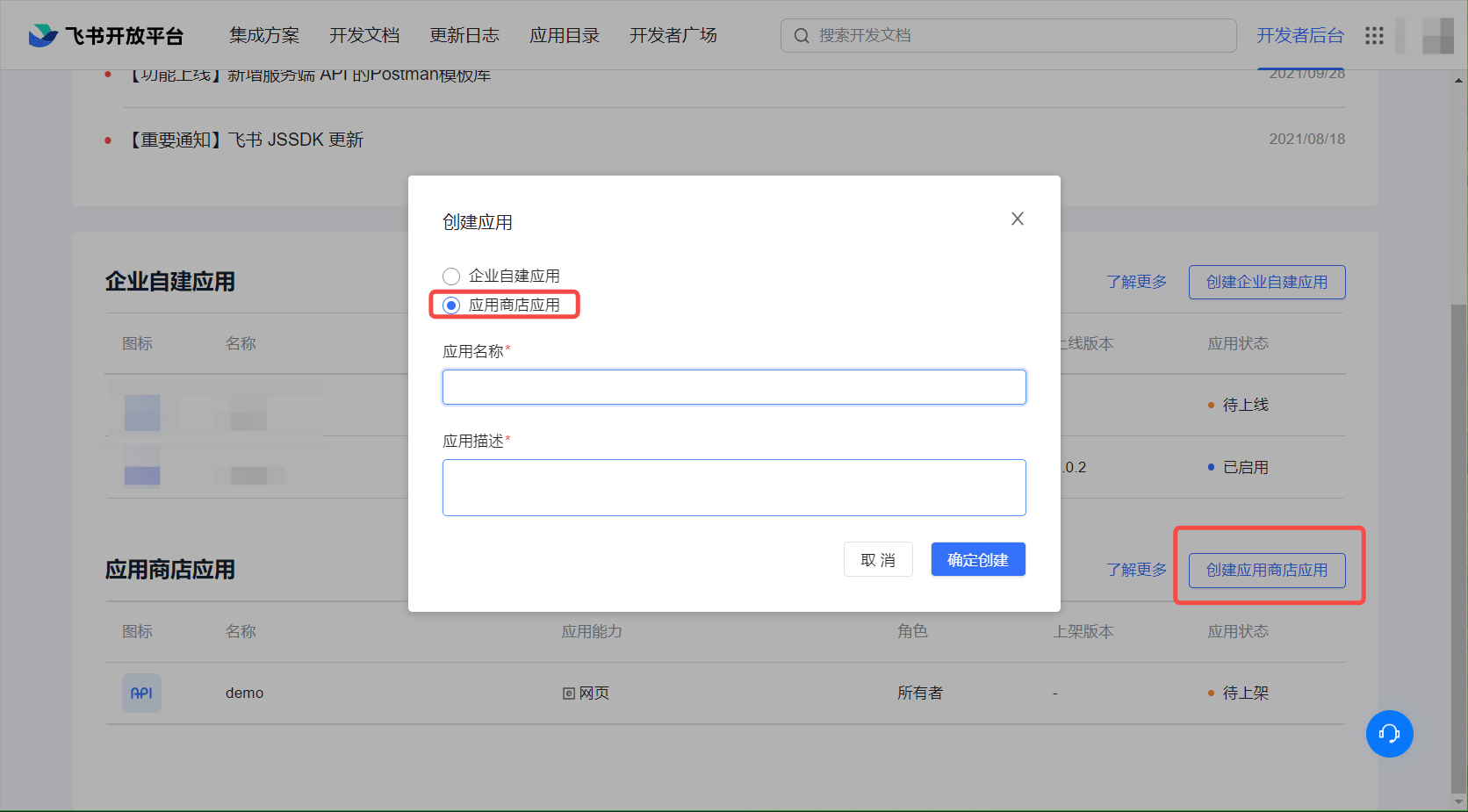 前往 飞书开发者后台 (opens new window),点击创建应用商店应用,填写相应内容,创建应用。