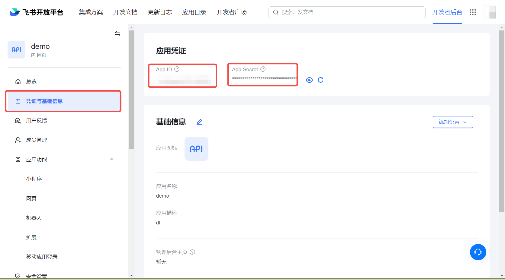 | App Secret | 在飞书应用的后台, 凭证与基础信息 中可以看到 App ID 和 App Secret 。 |