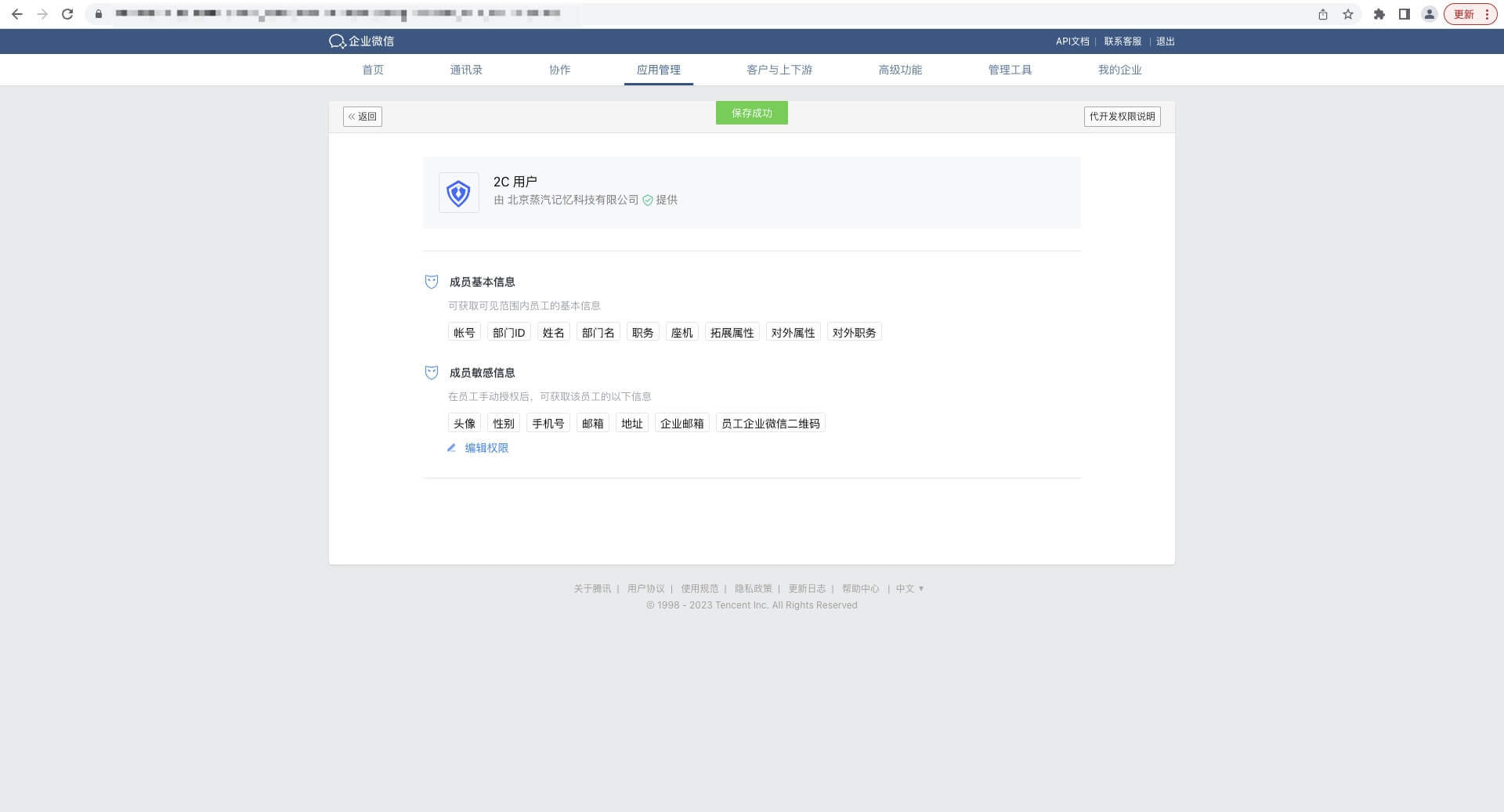 - 点击进入页面下方 授权信息,点击 自定义权限,添加允许的成员敏感信息。