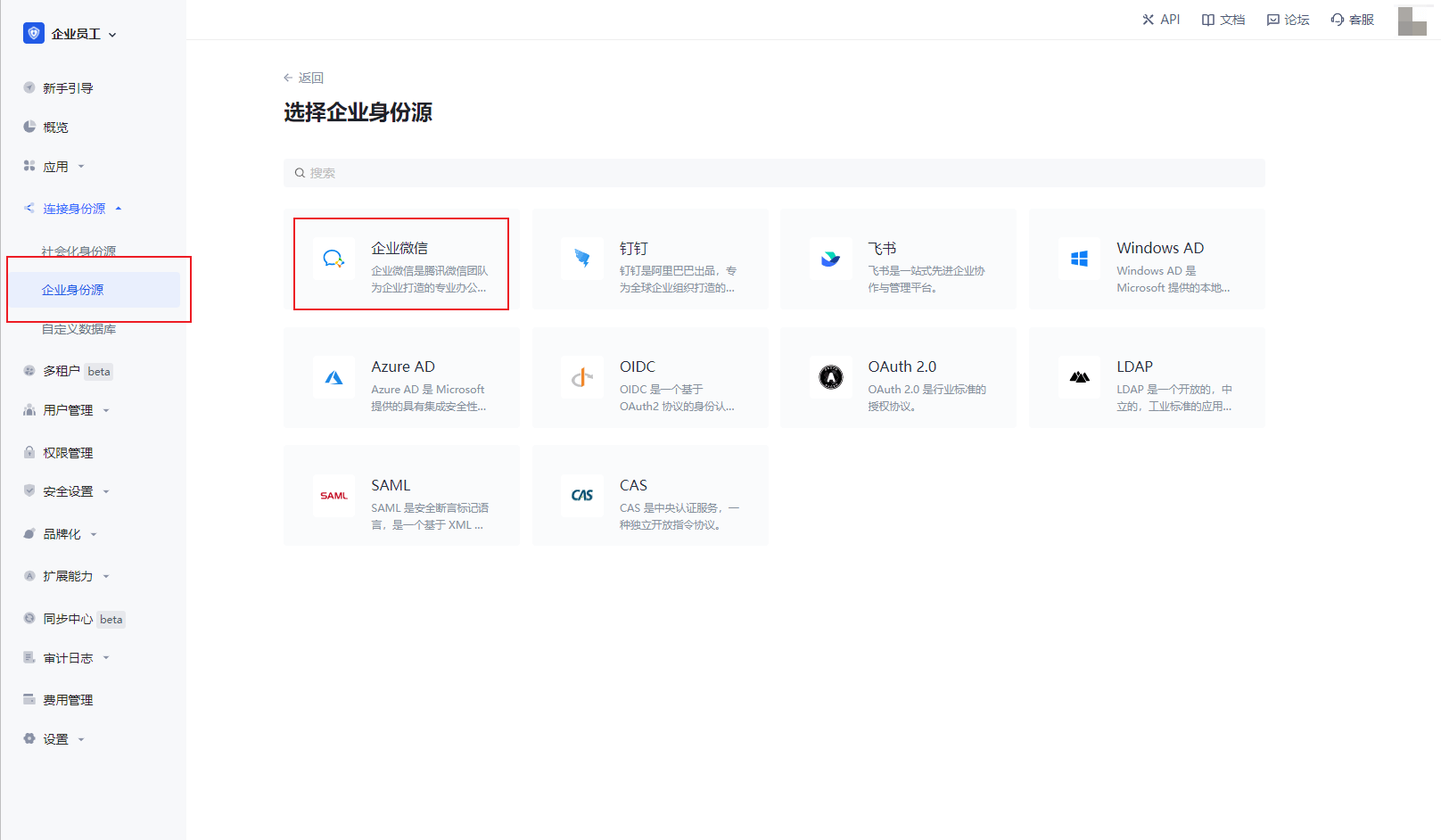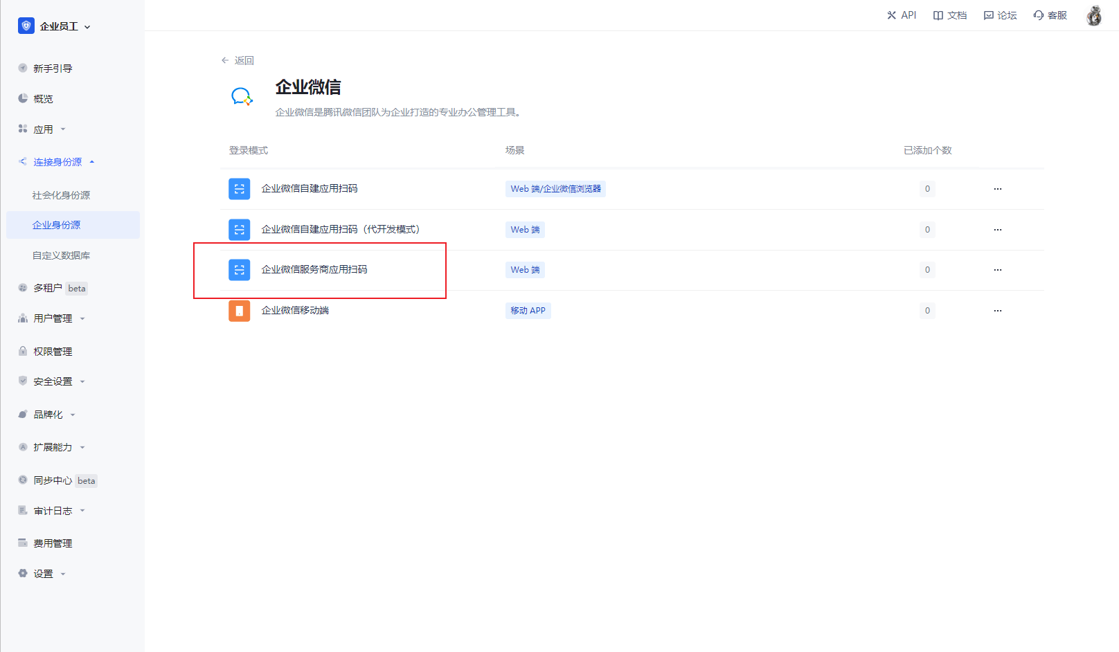 2.1 请在 Authing Console 控制台 的「企业身份源」页面,点击「创建企业身份源」按钮,进入「选择企业身份源」页面,选择「企业微信」身份源按钮,点击「企业微信服务商应用扫码」,进入 「企业微信服务商应用扫码 登录模式」页面。