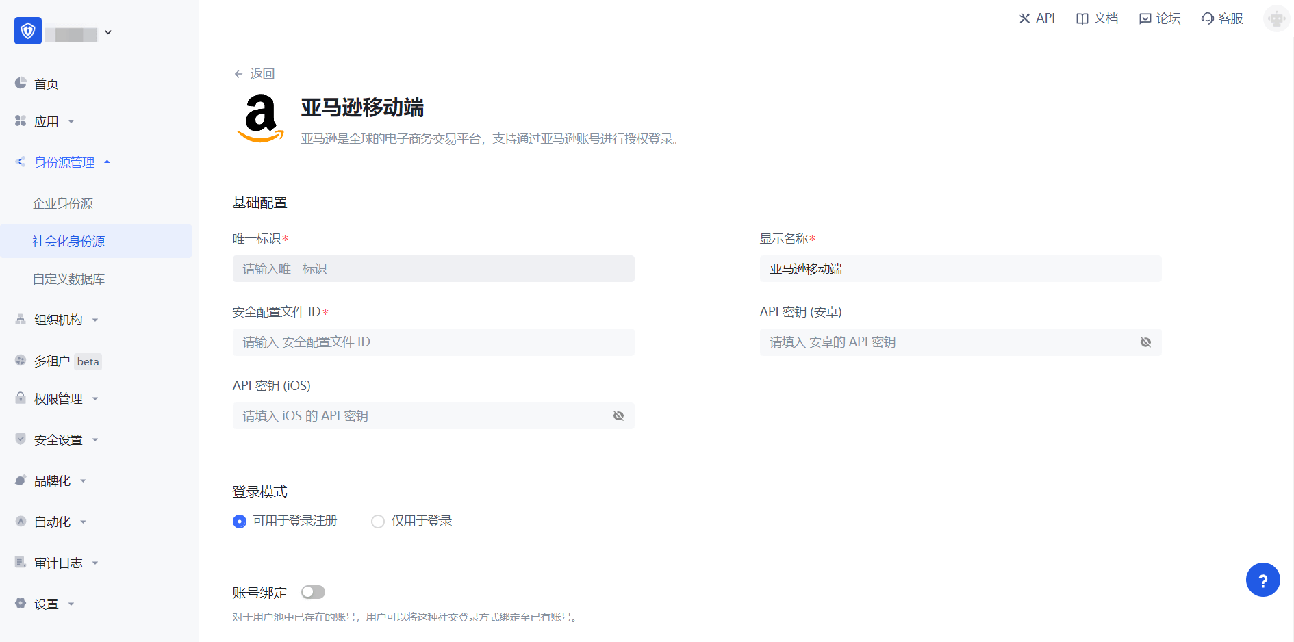 2.3 请在 Authing 控制台 的「社会化身份源」-「亚马逊移动端」页面,配置相关的字段信息。