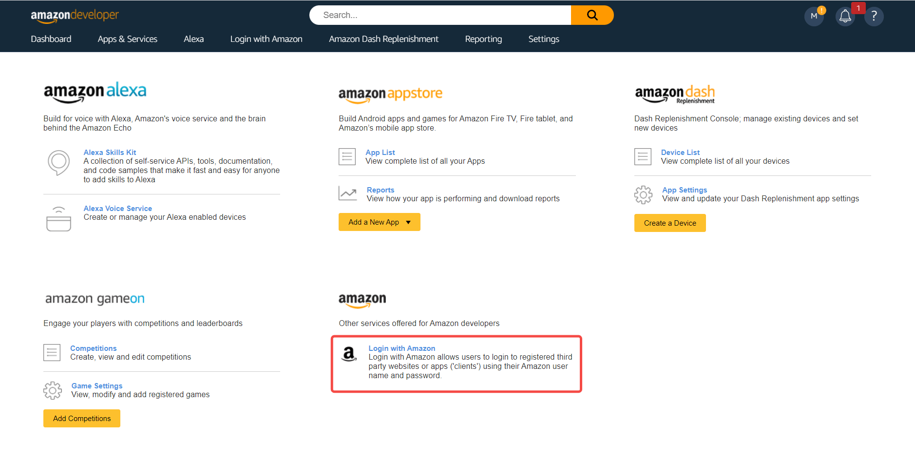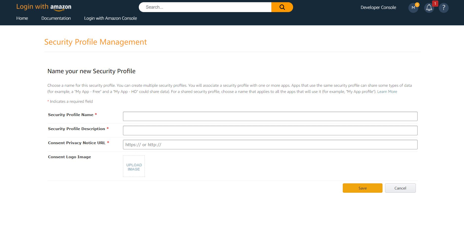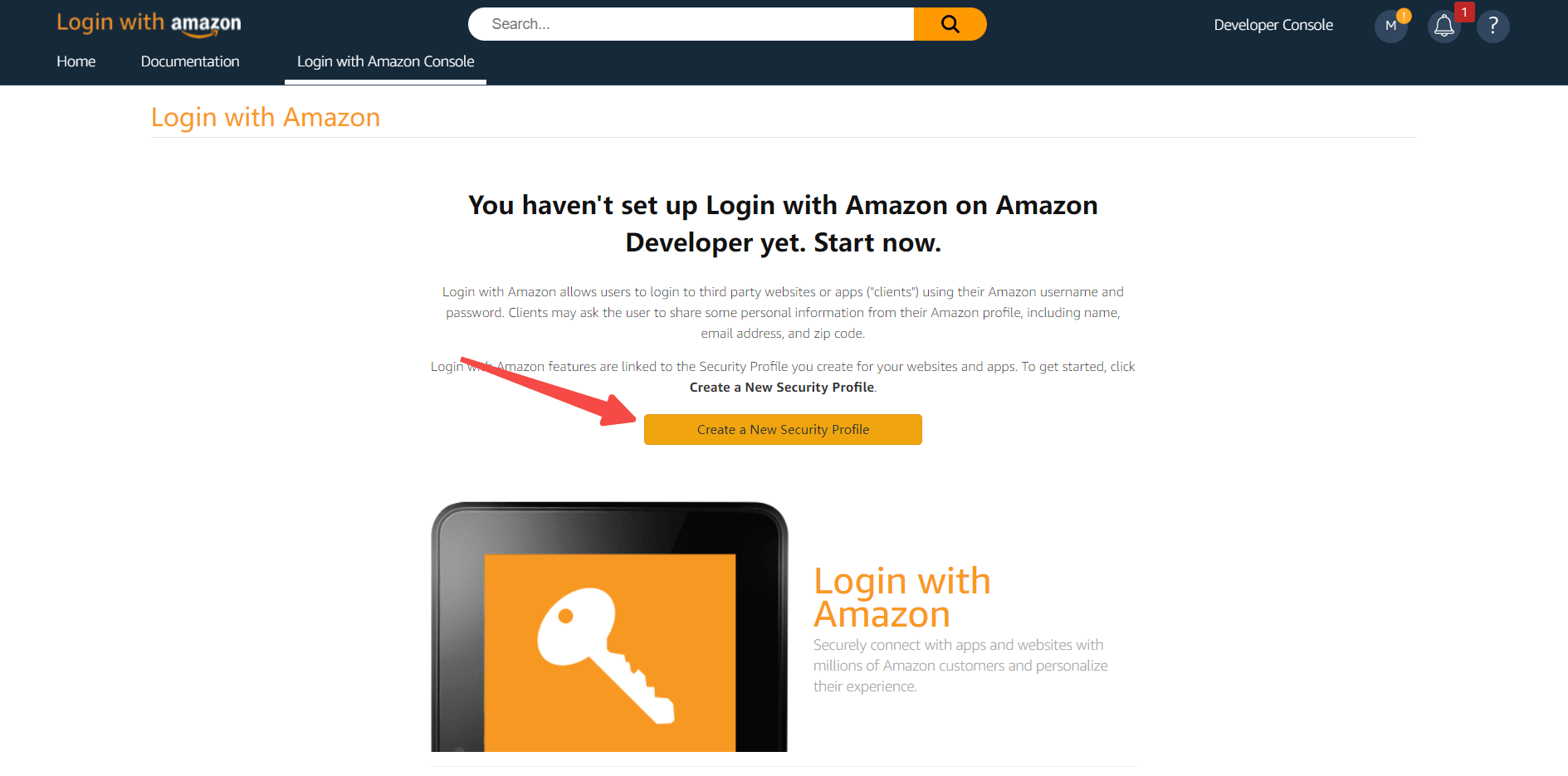 点击页面上方的「Developer Console」->「Login With Amazon」创建安全配置文件。过程中如遇到任何问题,请参考页面上方的亚马逊官方文档资料 Login with Amazon (opens new window)。