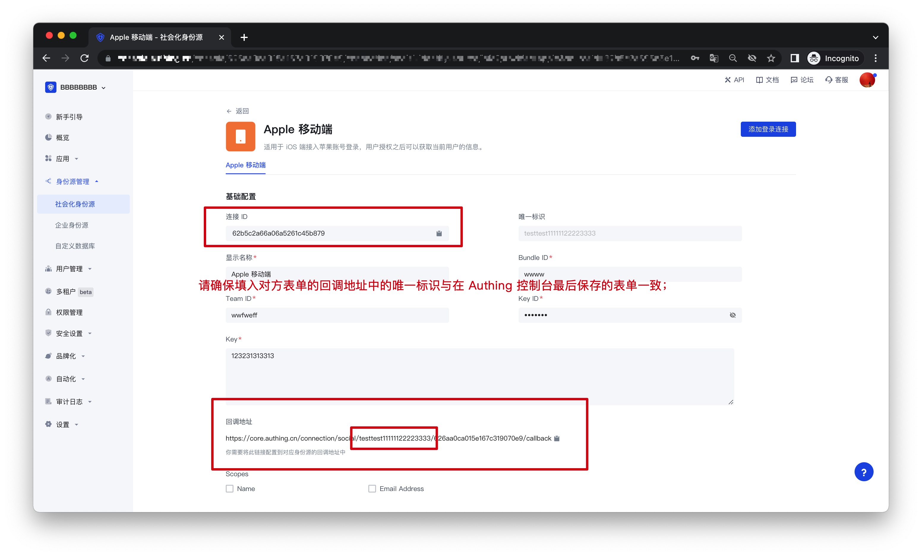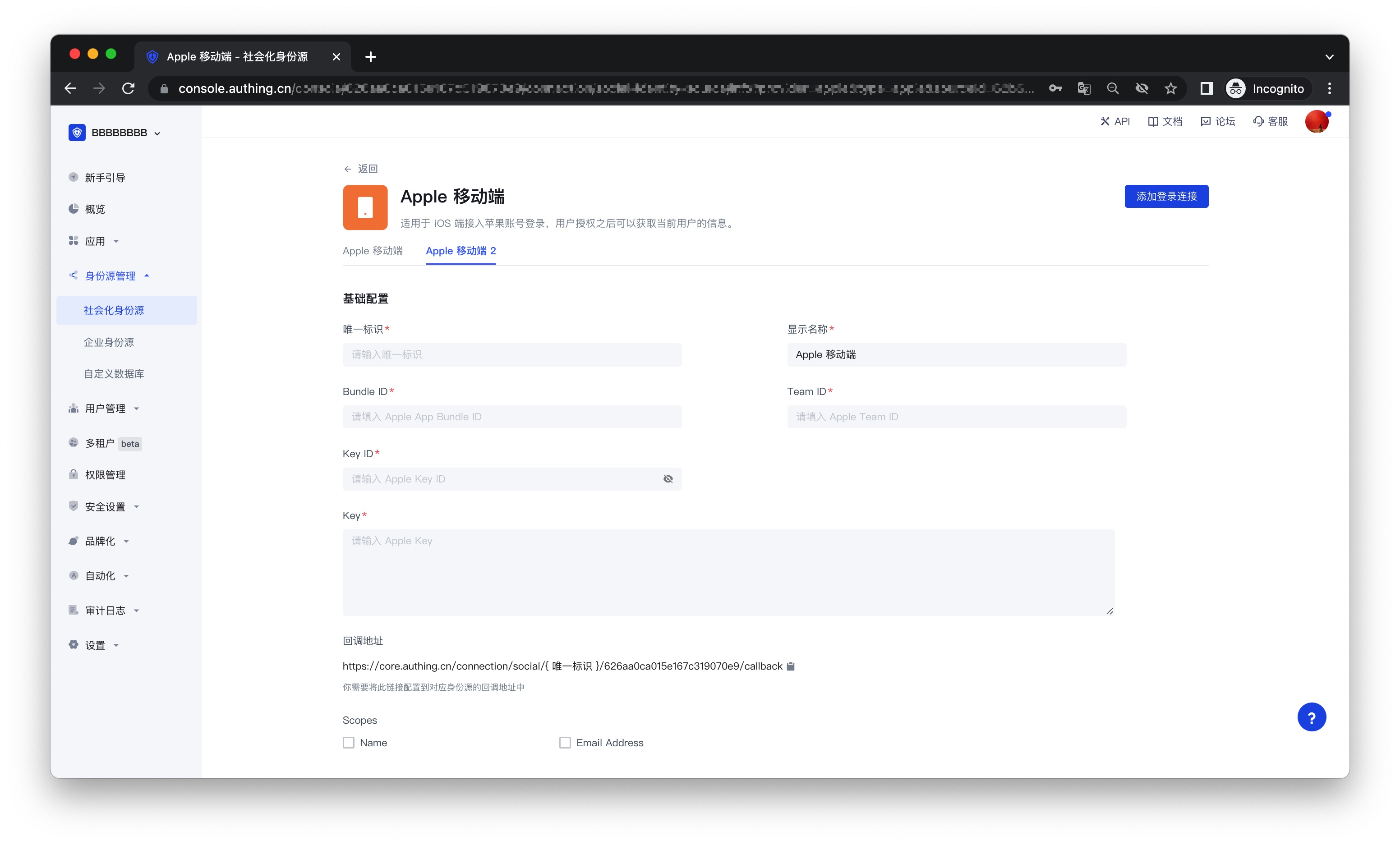| 回调地址 | a.请在苹果开发者平台的创建应用页面,粘贴该回调地址; b.确认该回调地址中的唯一标识部分要与创建后的身份源中的唯一标识部分保持一致; |
