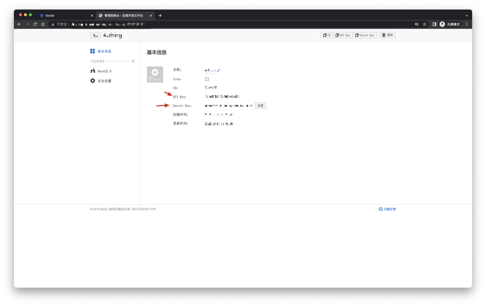 - 创建完成后,你需要记录下该应用的 API Key(即 Client ID) 和 Secret Key(即 Client Secret),后面需要用到。