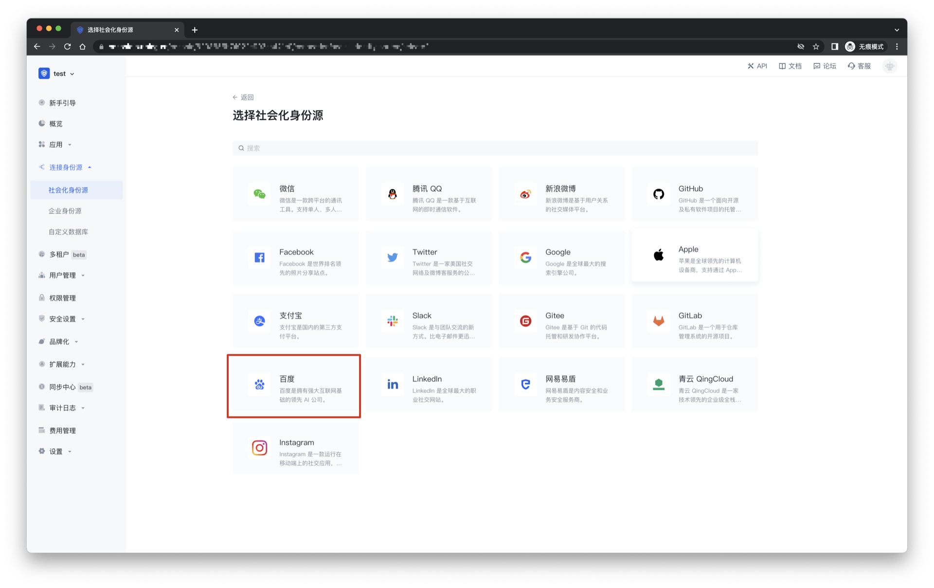2.2 请在 Authing 控制台 的「社会化身份源」-「选择社会化身份源」页面,点击「百度」身份源按钮,进入 「百度登录模式」页面。