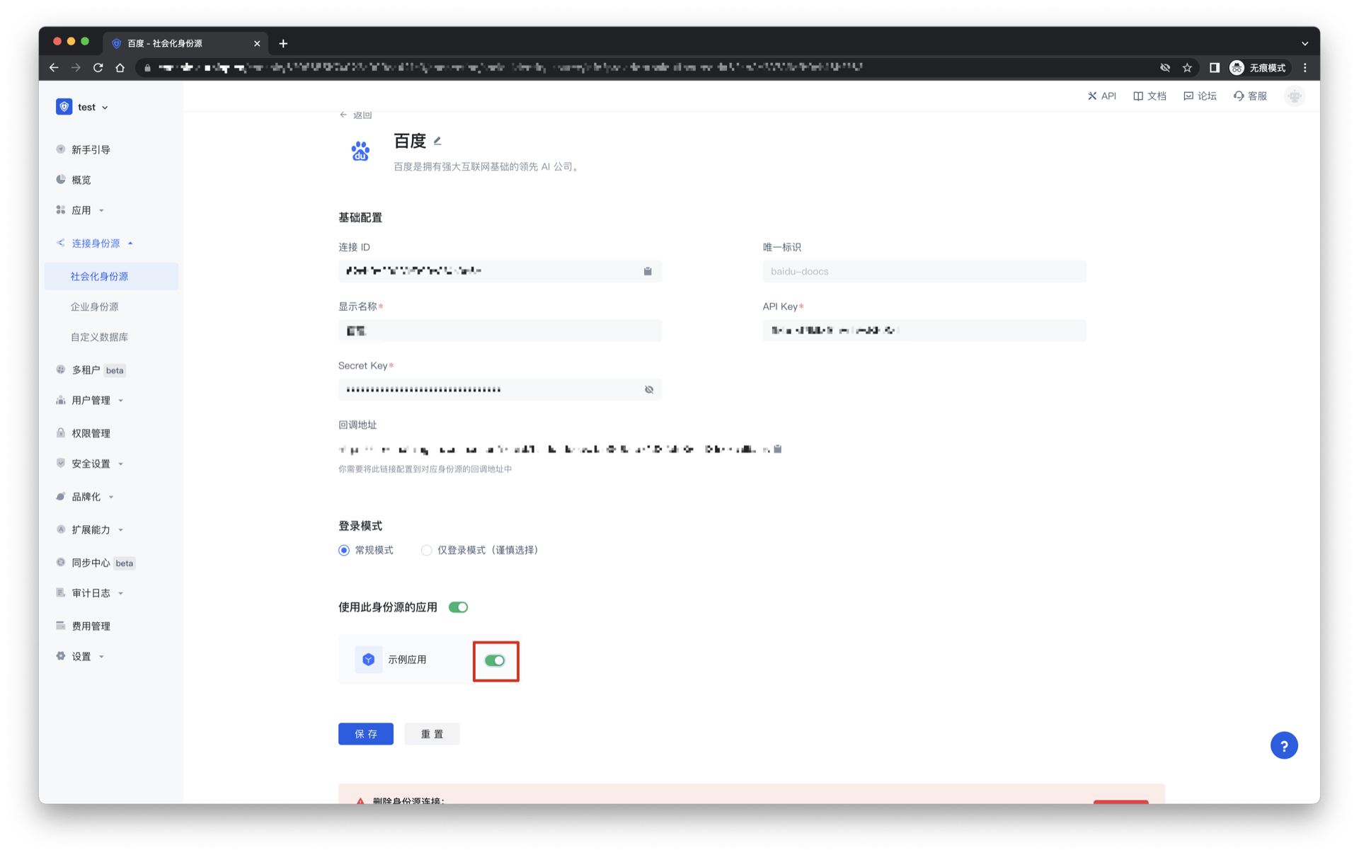2.3 请在 Authing 控制台 的「社会化身份源」-「百度」页面,配置相关的字段信息。