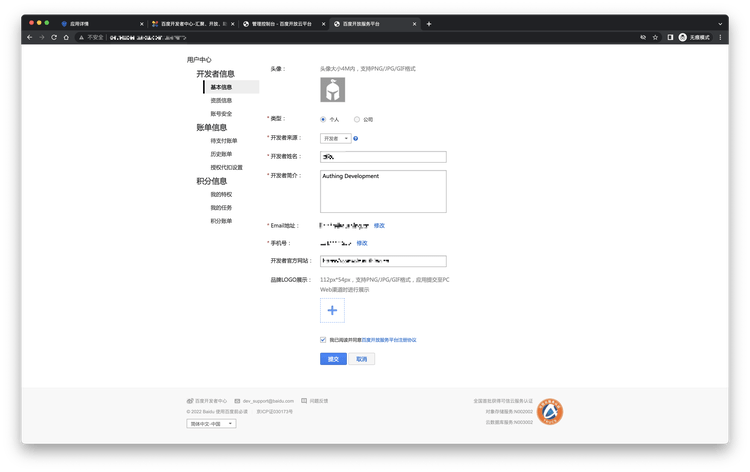 - 注册百度开发者中心 (opens new window),登录后前往百度开发者服务管理控制台 (opens new window),填写开发者信息,并创建一个工程(应用):