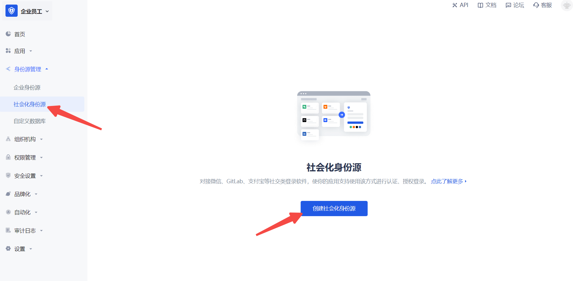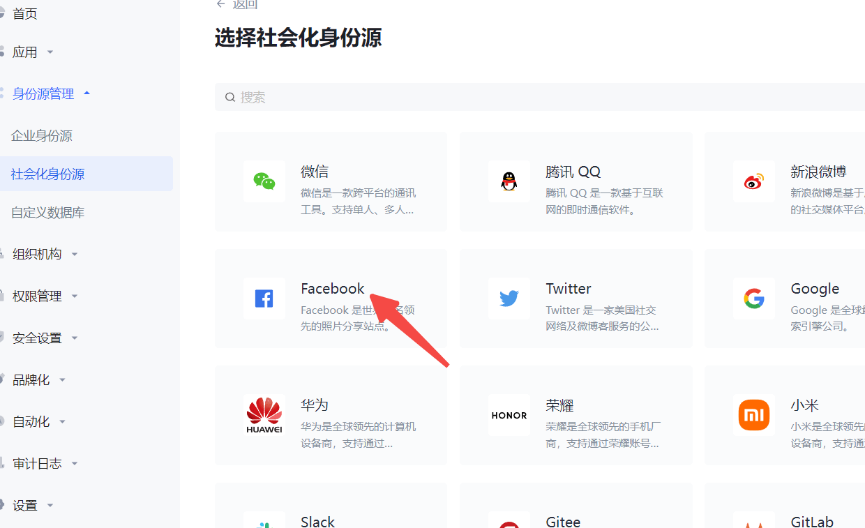 - 在 Atuhing 控制台 的 社会化身份源 页面点击 创建社会化身份源 按钮,进入 选择社会化身份源 页面。