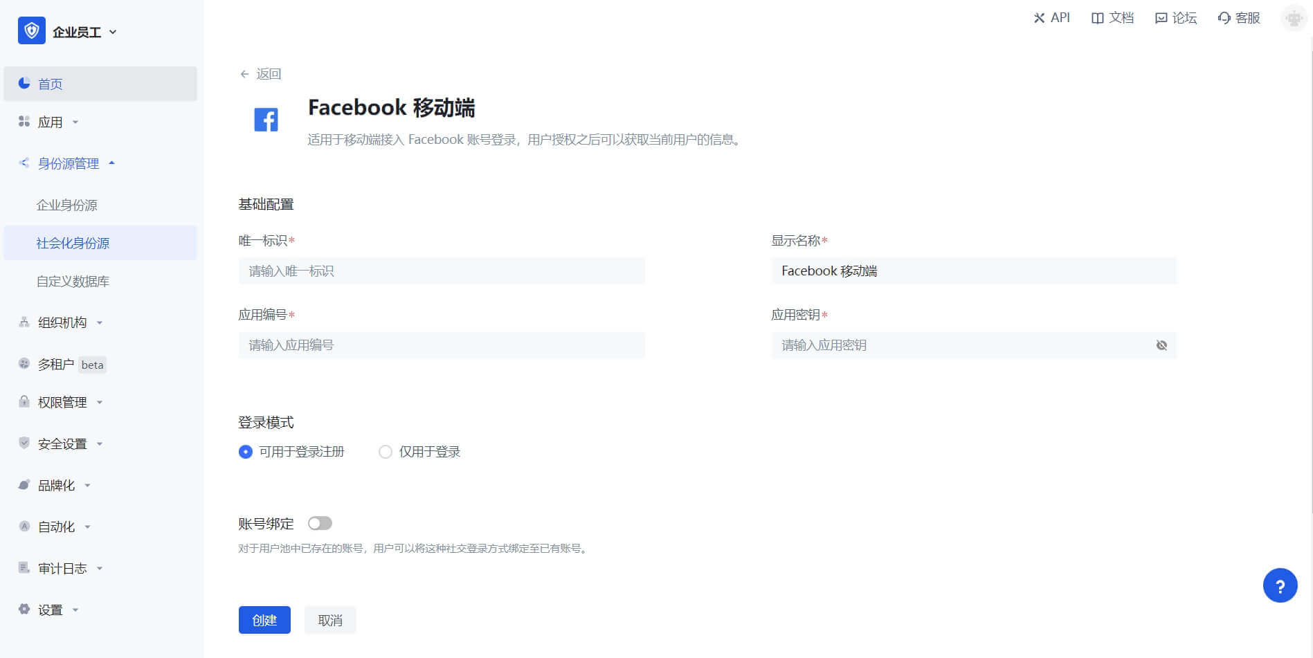 - 请在 Authing 控制台 的「社会化身份源」-「Facebook 移动端」页面,配置相关的字段信息。