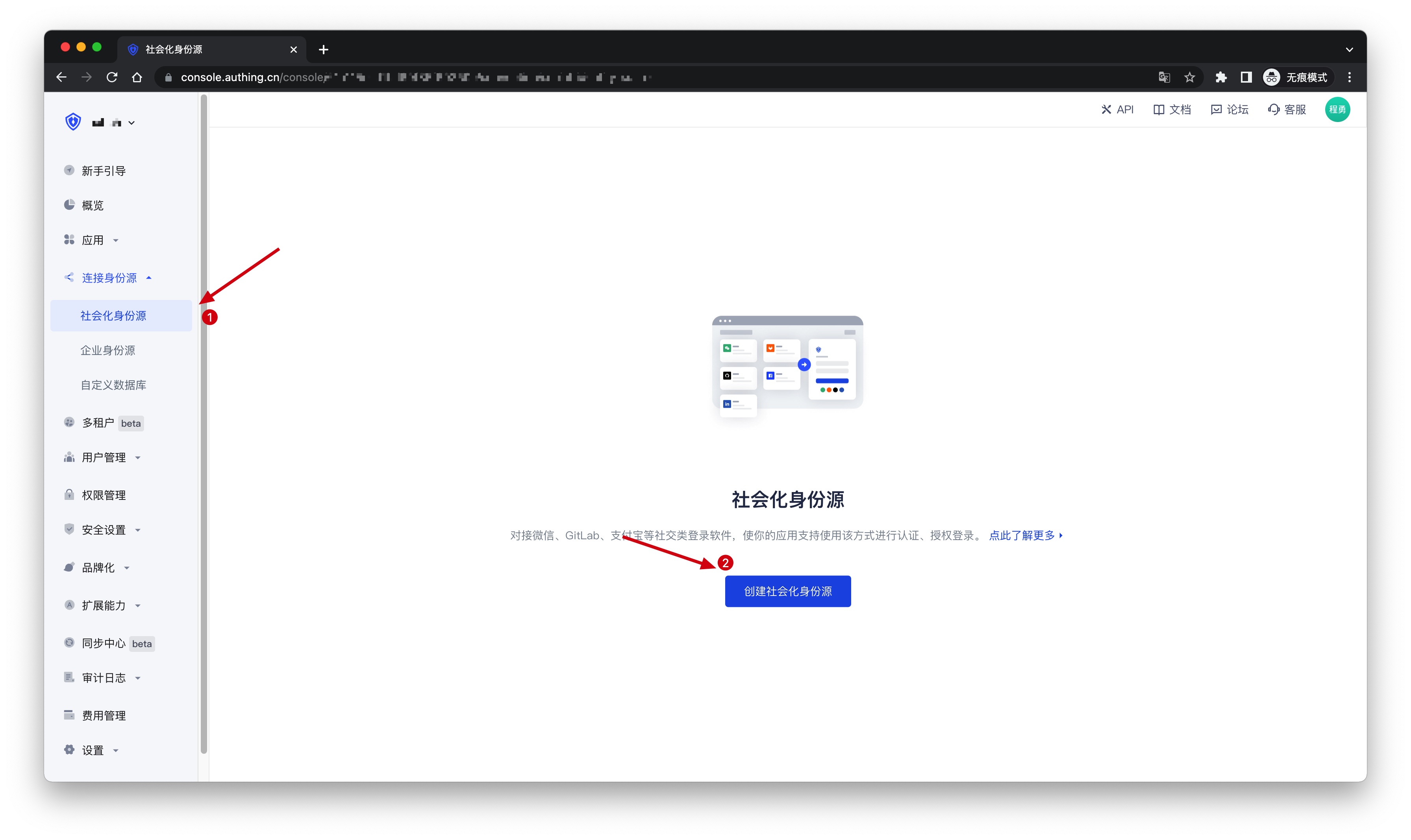 2.1 请在 Authing 控制台的「社会化身份源」页面,点击「创建社会化身份源」按钮,进入「选择社会化身份源」页面。